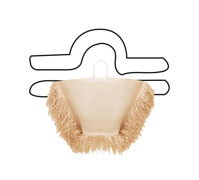 В огромной соломенной сумке Jacquemus поместятся все печали, годовой запас полезных перекусов и одежда в спортзал, а при желании там можно спрятаться и самой. Нерешительным Весам тренд на массивные сумки особенно придется по вкусу. Не забудьте положить поверх всего солнцезащитный крем от летнего солнца.