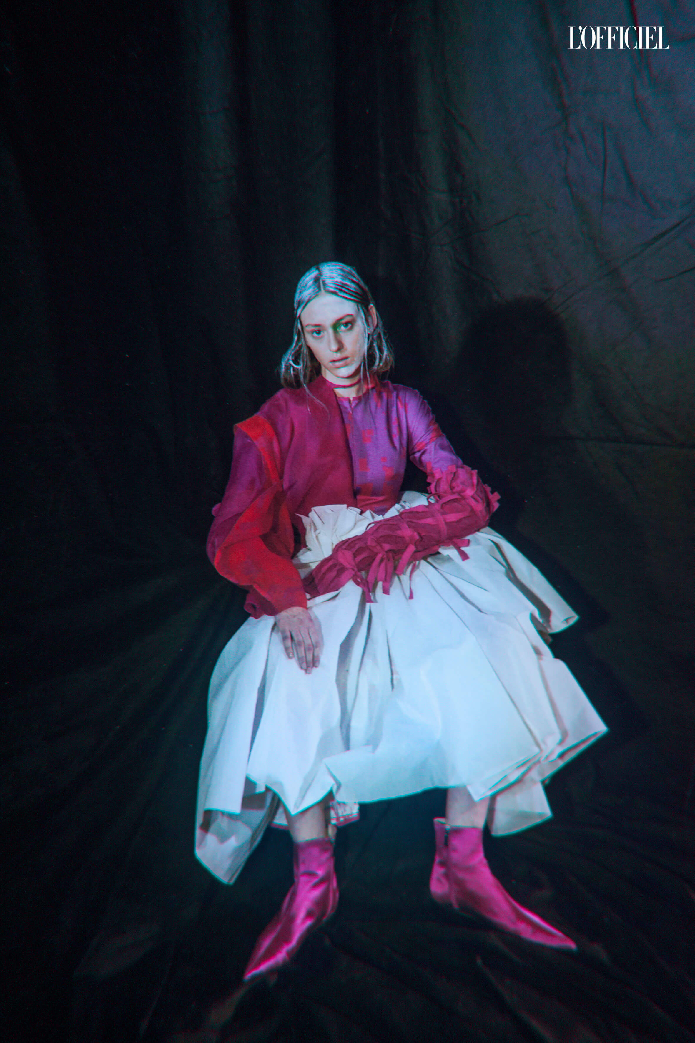 В многослойных нарядах Елизаветы Волосовской преобладает кроваво-красный цвет, ленты и пояса, подобно змеям, струятся по телу модели, а изящные атласные туфельки становятся намеком на театральную инфантильность, присущую героиням "Суспирии" 1977 года.