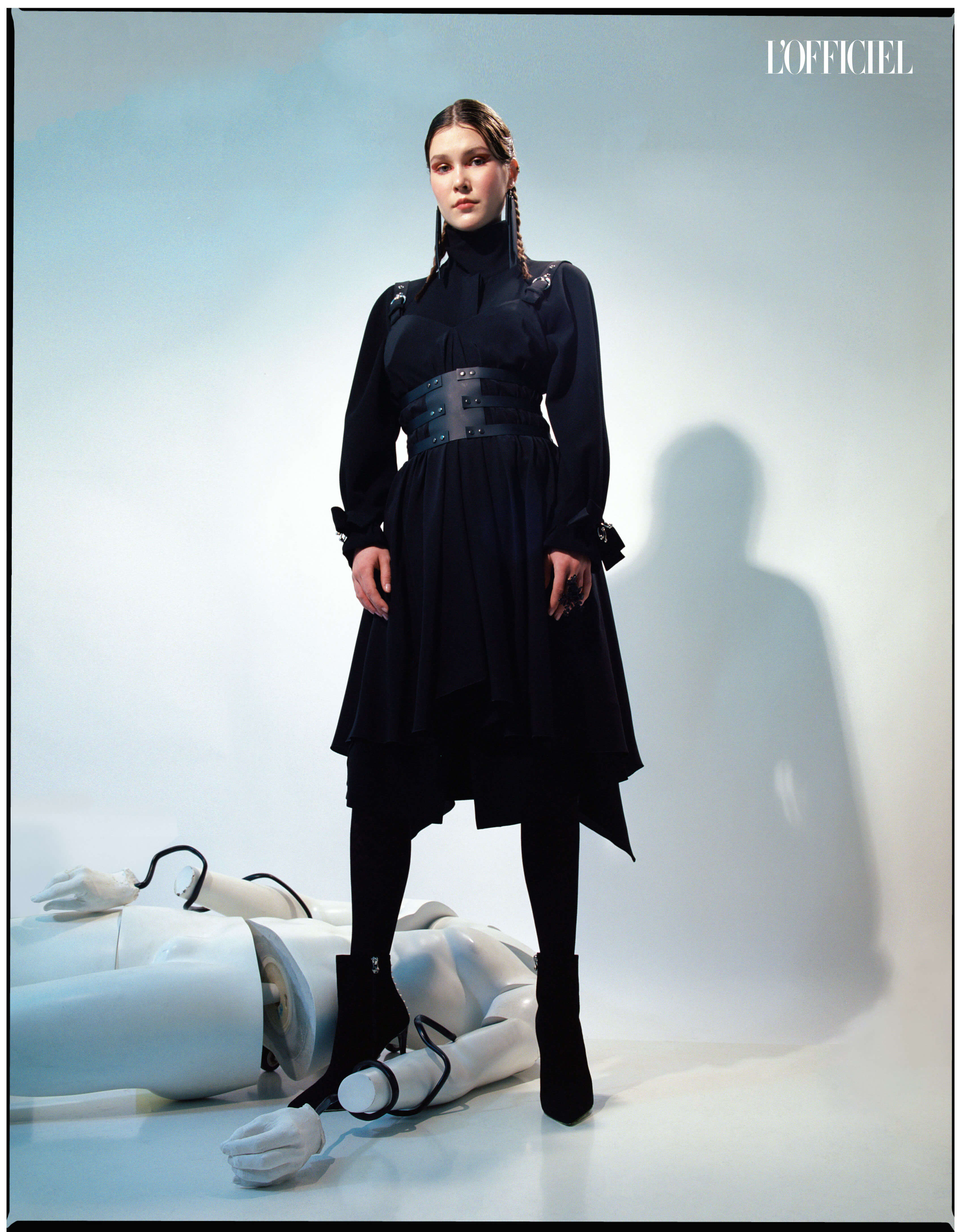 Платье Keepsake, сапоги Virois, пояс Rhea Costa, цепочка Dsquared2, пояс-корсет Ann Demeulemeester, серьги — собственность стилиста, ожерелье — винтаж