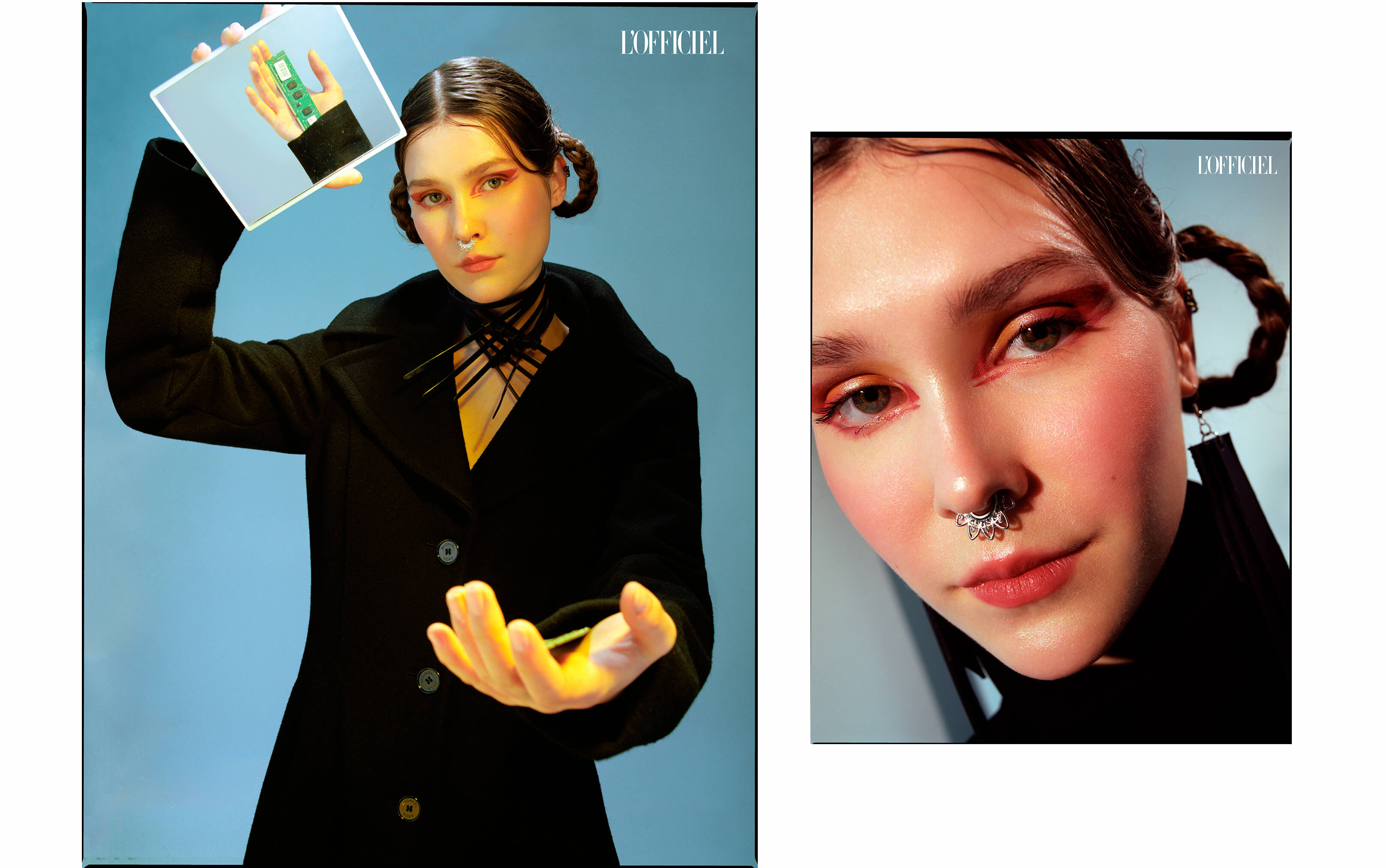 Слева: пальто Michael Kors, пирсинг септума — собственность стилиста. Справа: платье Moschino, пирсинг септума и серьги — собственность стилиста