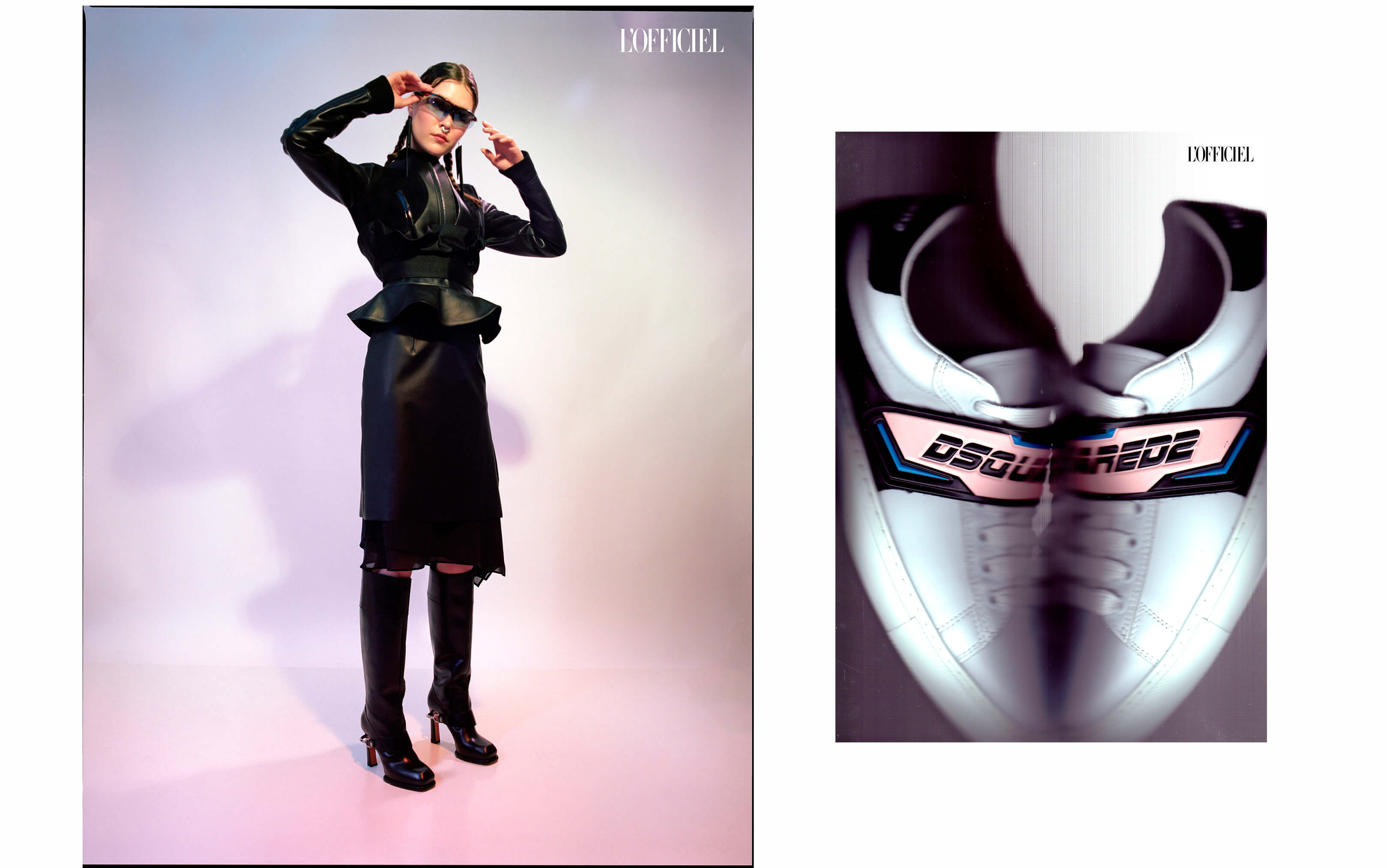 Слева: куртка Dsquared2, пояса, надетые как корсет, Rhea Costa, юбка Cedric Charlier, сапоги Virois, очки Oakley, серьги и пирсинг септума — собственность стилиста. Справа: кроссовки Dsquared2