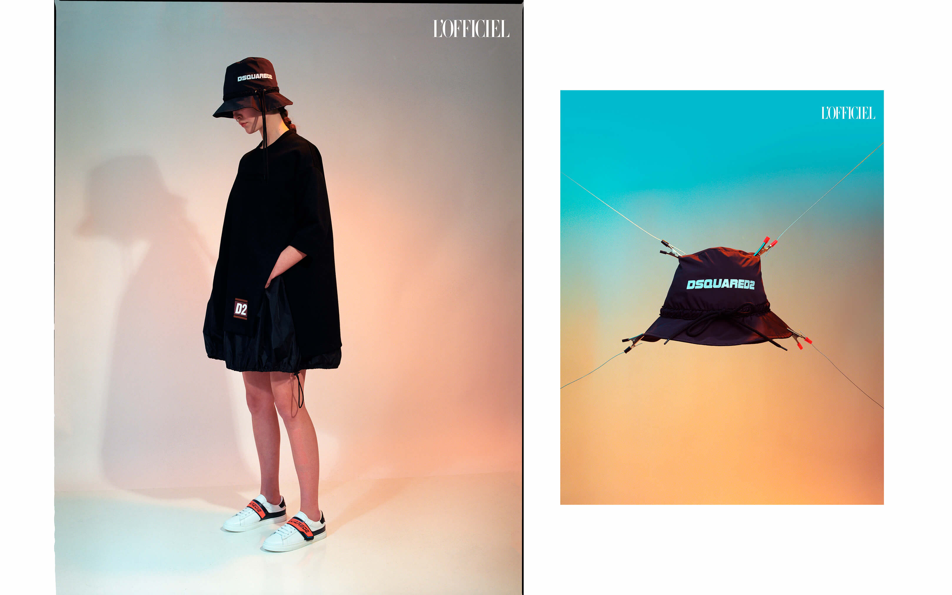 Слева: платье, кроссовки и панама — всё Dsquared2. Справа: панама Dsquared2