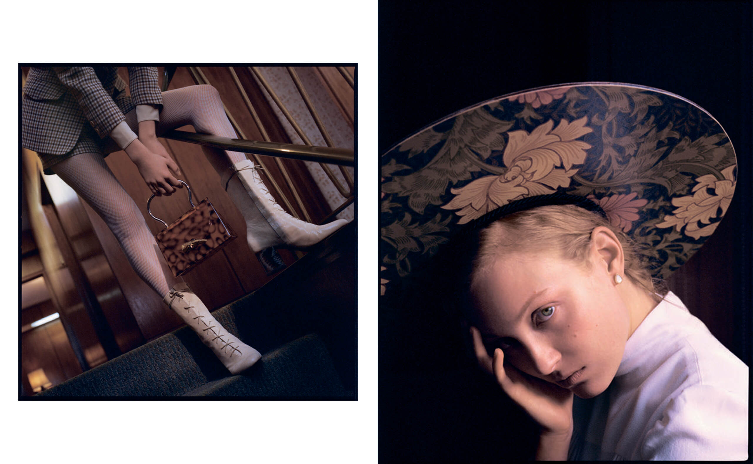 Слева: жакет и шорты Nanushka, блузка Chloé, сапоги Alexa Chung, сумка Peet Dullaert, колготки, собственность стилиста. Справа: платье Bella Freud, шляпа Eliurpi, серьги Boucheron