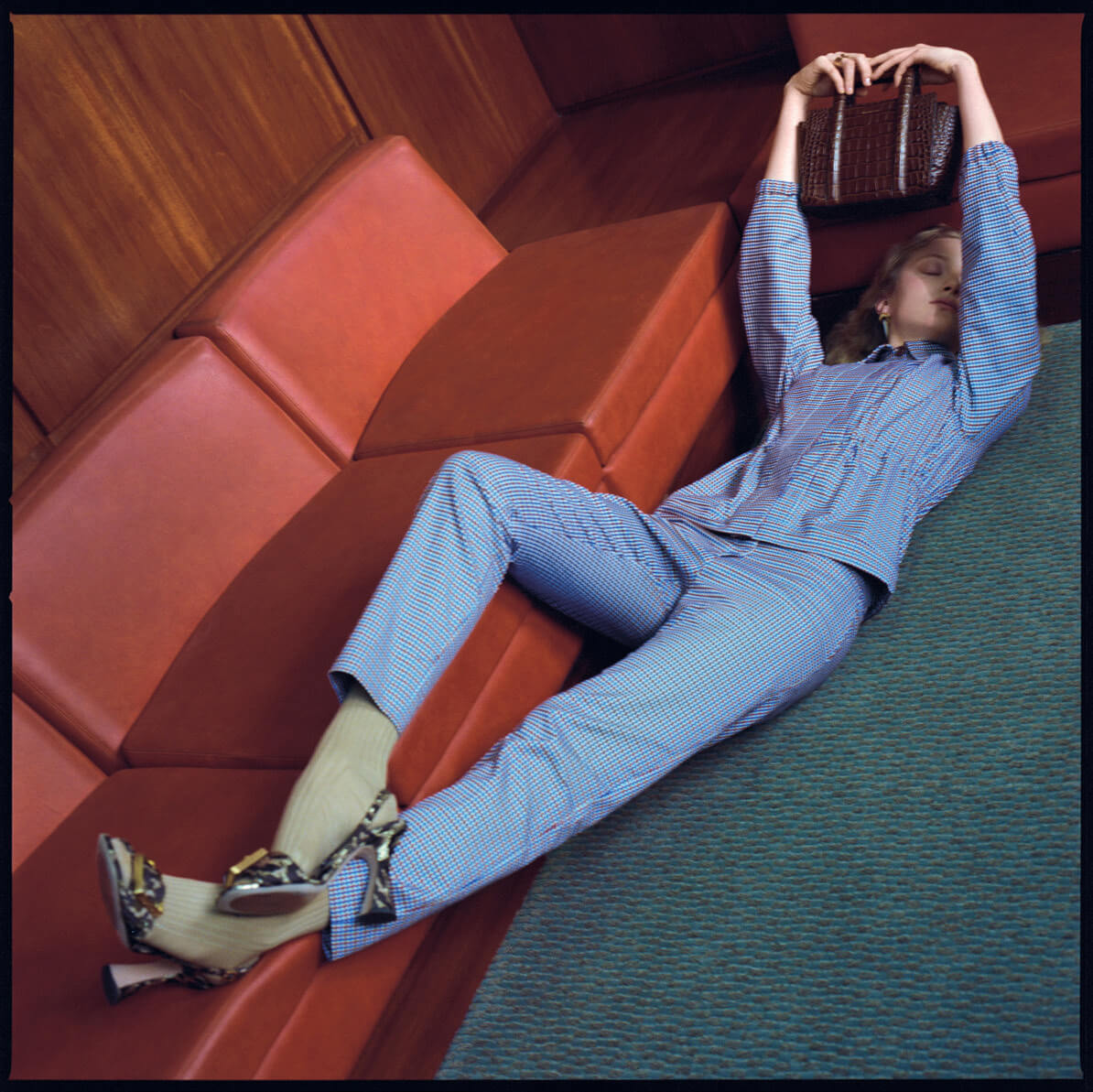 Жакет и брюки Dries Van Noten, носки Pantherella, сумка Rejina Pyo, туфли Rochas, серьги Ejing Zhang, кольцо Christian Dior