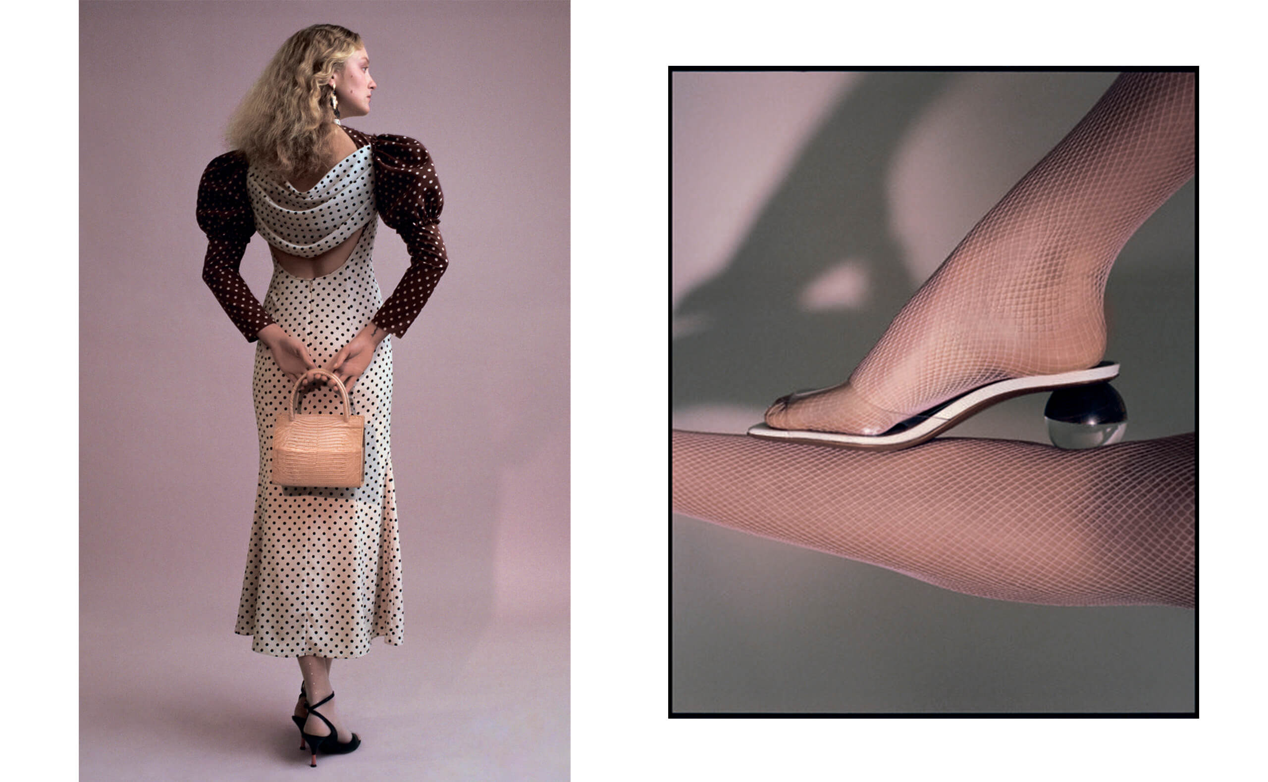 Слева: платье Rejina Pyo, колготки Charnos, сумка By Far, босоножки Kenzo, серьги Peet Dullaert. Справа: мюли Neous, колготки, собственность стилиста