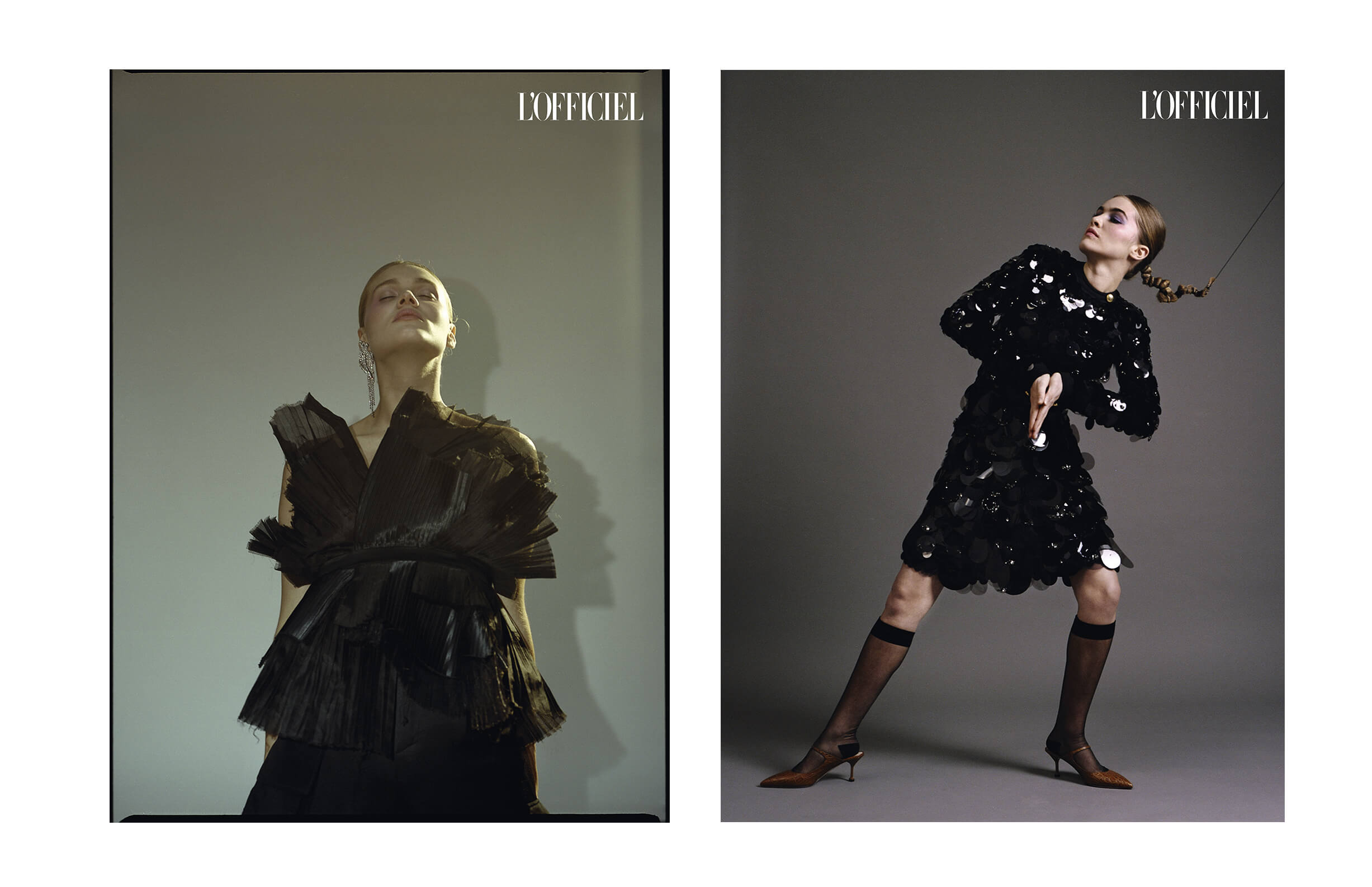 Слева: костюм Ronald Van Der Kemp, серьги Helene Zubeldia. Справа: платье, гольфы, мюли, Prada