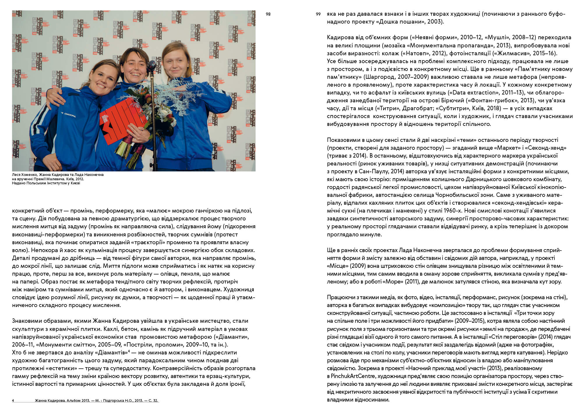 И Кадырова, и Клейтман, и Наконечная, и Щербина стали героинями книги “Чому в українському мистецтві є великі художниці” (2019), созданной Исследовательской платформой PinchukArtCentre. Книга — это рассказ об истории украинского искусства с помощью биографий и работ художниц с конца ХІХ века до сегодняшнего дня.