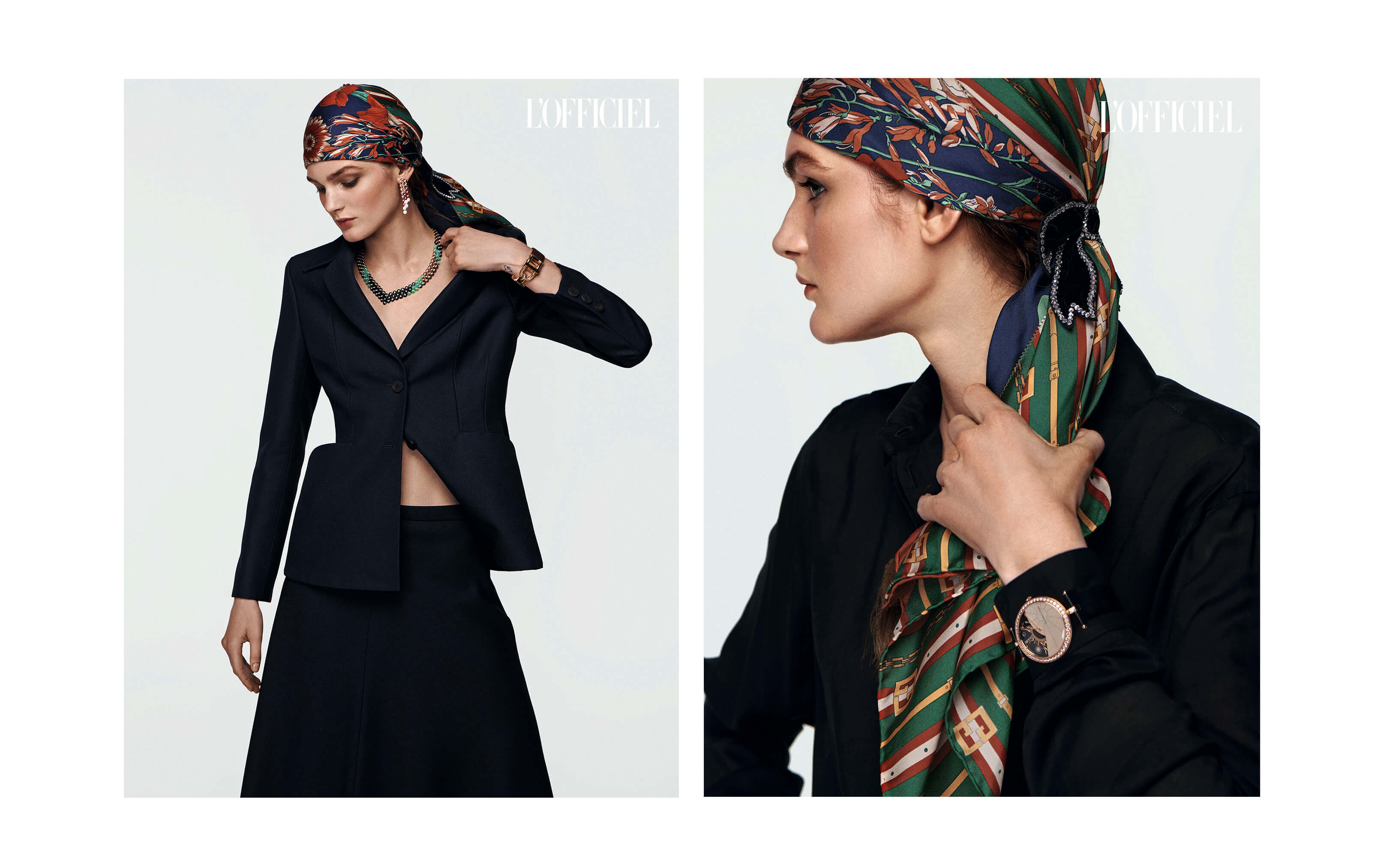 Серьги Bouton d’or, колье Bouton d’or, золотые часы Cadenas, Van Cleef & Arpels, жакет и юбка, Christian Dior, тюрбан Gucci, блуза Saint Laurent