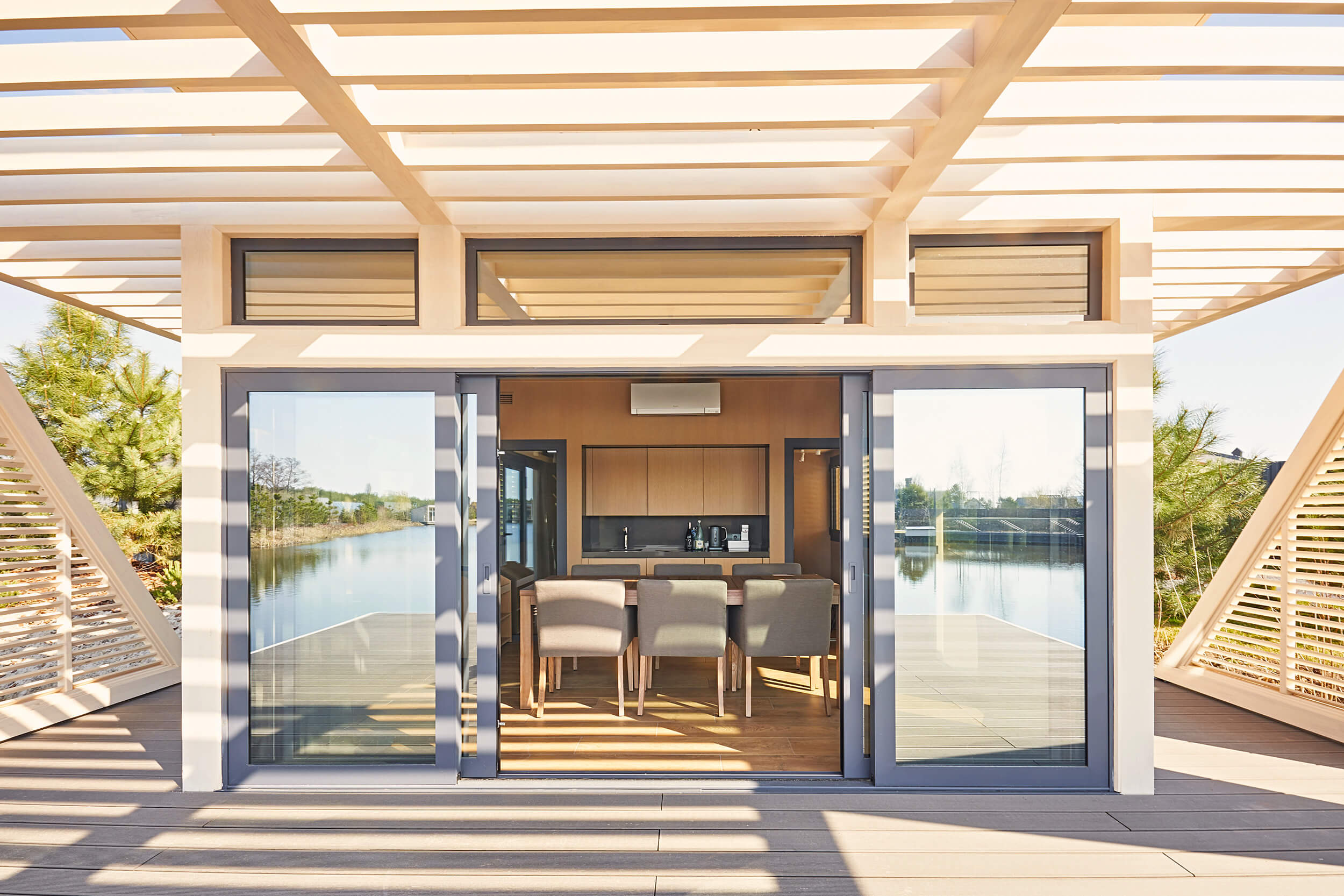 В комплексе есть два варианта размещения: двухуровневые номера в доме на воде, где могут расположиться до 4 человек, и двухэтажный плавучий дом с четырьмя спальнями и сауной.