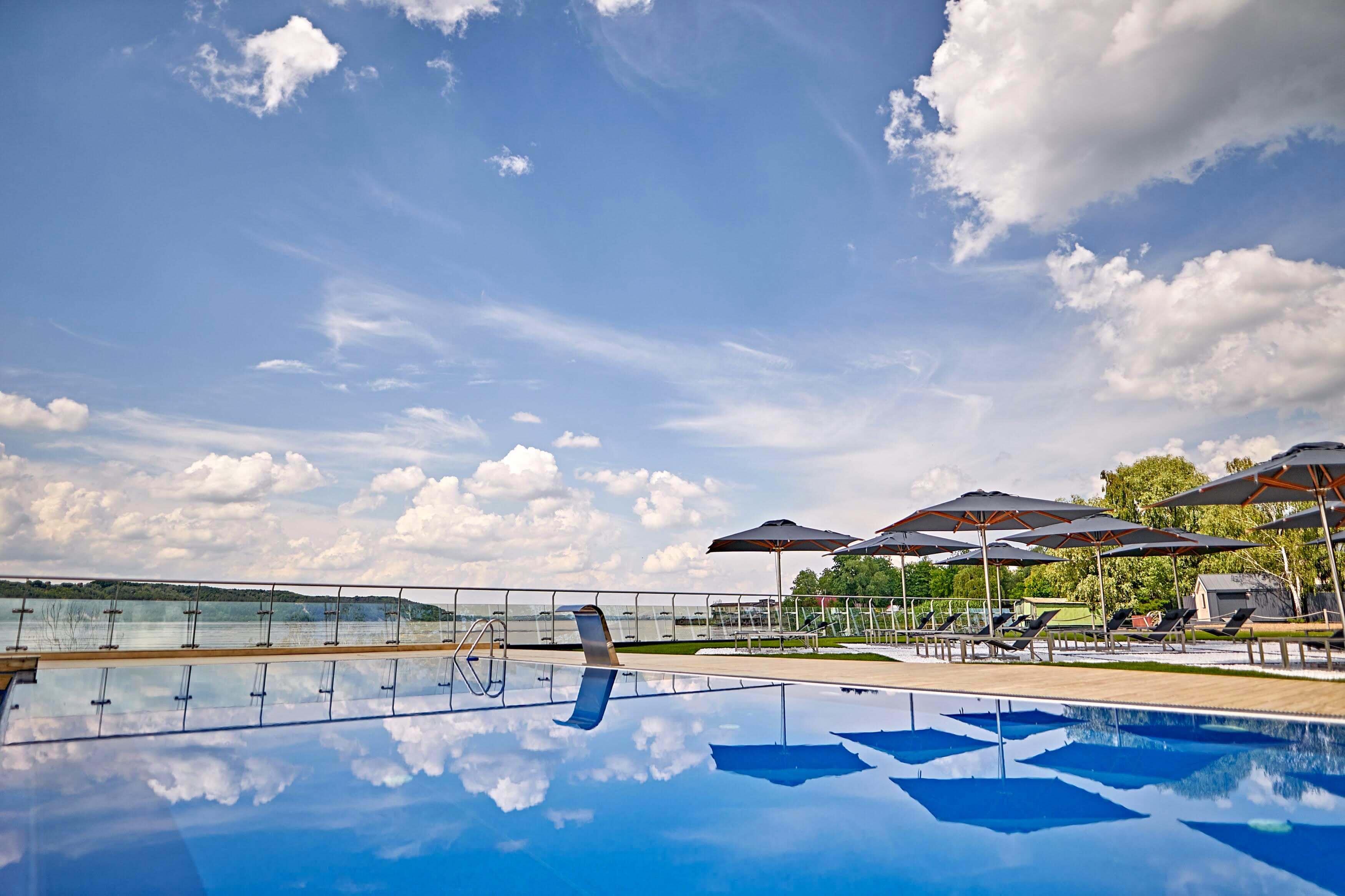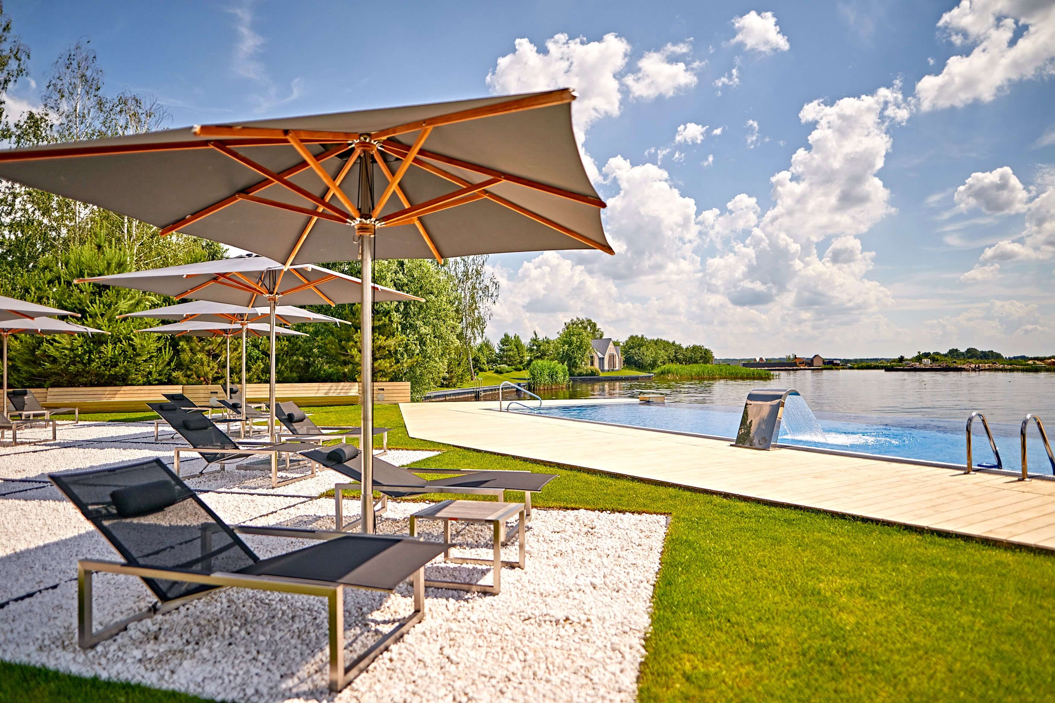 В аква-зоне с видом на Днепр работает первый в Украине четырехсторонний инфинити-бассейн с подогревом. Его наполняют водой из артезианского источника, которая способствует полному расслаблению.