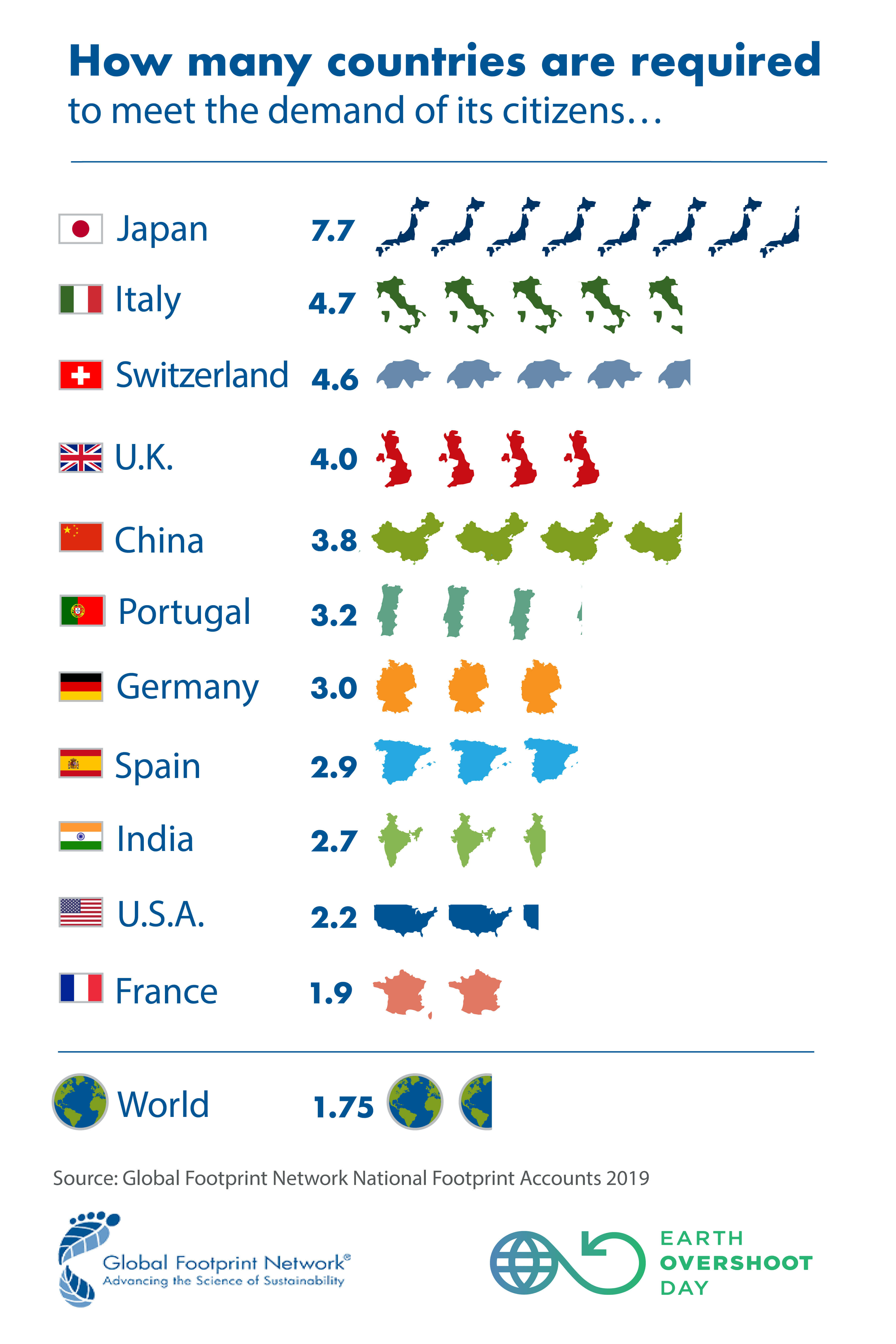 Несмотря на то, что с 2010 года темпы потребления ресурсов в мире снизились, перерасход ресурсов опережает способность к самовосстановлению систем. 29 июля — средняя дата экодолга всех стран, причем разные государства израсходуют ресурсы неодинаково. Эксперты разделяют страны на “дебиторов” и “кредиторов” ресурсов Земли. Среди стран, берущих “взаймы”, выделяют Китай, Индию, США, Саудовскую Аравию и большую часть ЕС, а донорами ресурсов являются Бразилия, Канада, Австралия, Швеция, Финляндия и Россия.