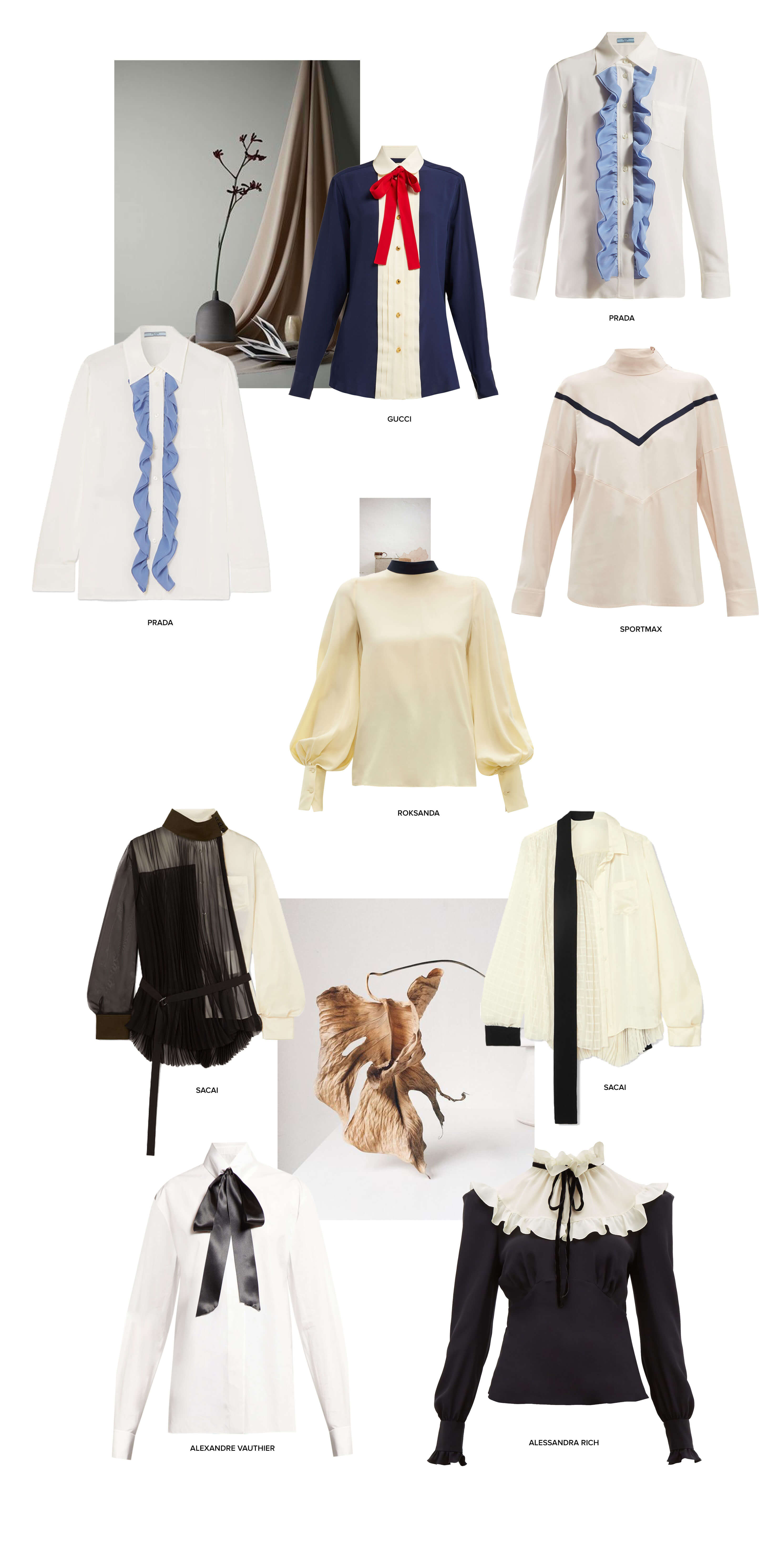 Когда хочется нескучной умеренности, выбирайте блузу сдержанного оттенка с контрастной деталью — это может быть бант у ворота, планка или декоративная строчка. Ваш образ сохранит буржуазную непринужденность и элегантность.