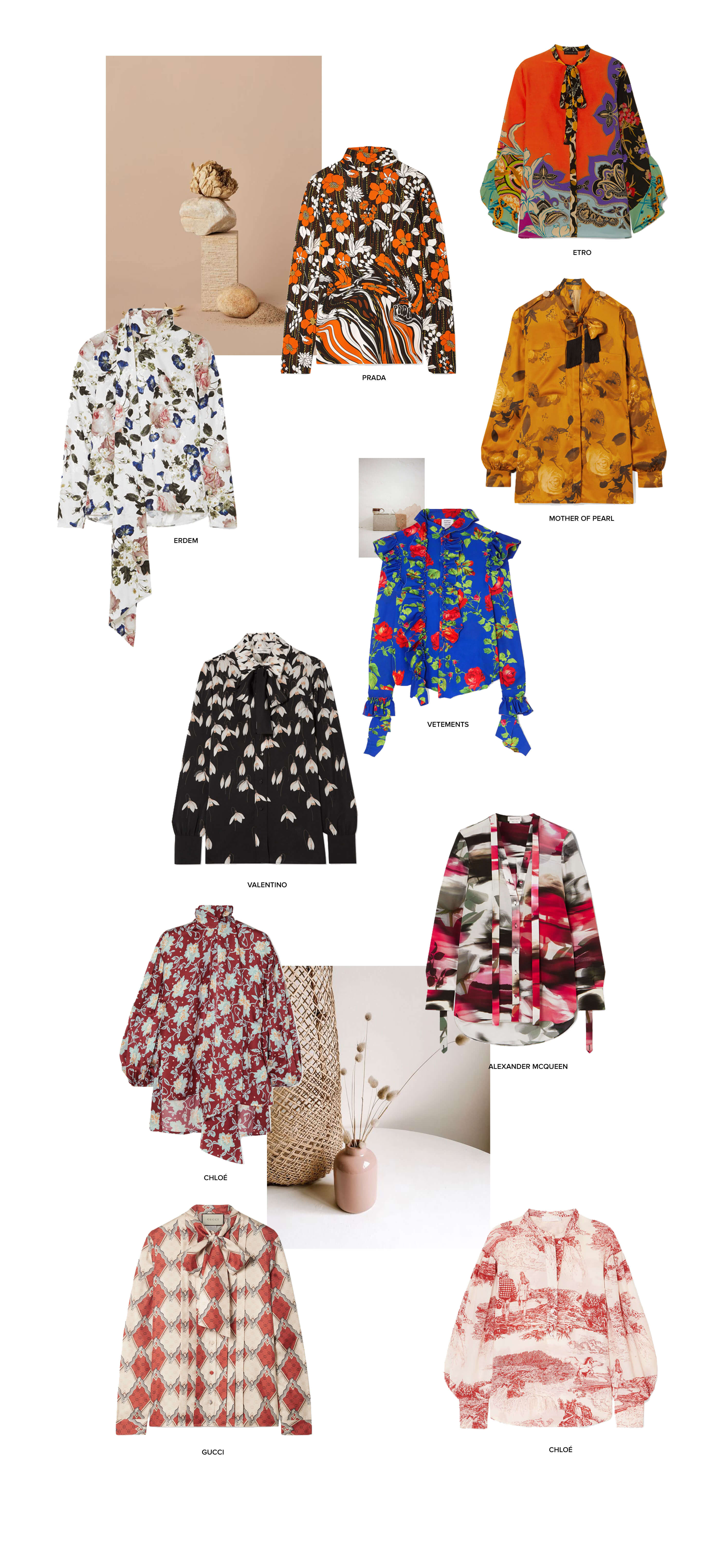 Пусть это и отдаёт "разгульной цыганщиной", не стоит бояться экспериментов. В этом сезоне распустившиеся букеты садовых роз, лепестки полевых цветов и абстрактные калейдоскопические мотивы призваны поддержать в нас лёгкость, кураж и романтику. Аляповатые на первый взгляд, такие блузы могут выглядеть непревзойденно в комплекте с серым брючным костюмом или двойкой любимого цвета — от пастельных до насыщенных. Самым необычным ходом станет сочетание блузы с ярким принтом и коричневого костюма — всё это стоит дополнить белыми кроссовками или лодочками, а украшения выбрать утрированные и без драгоценных камней.