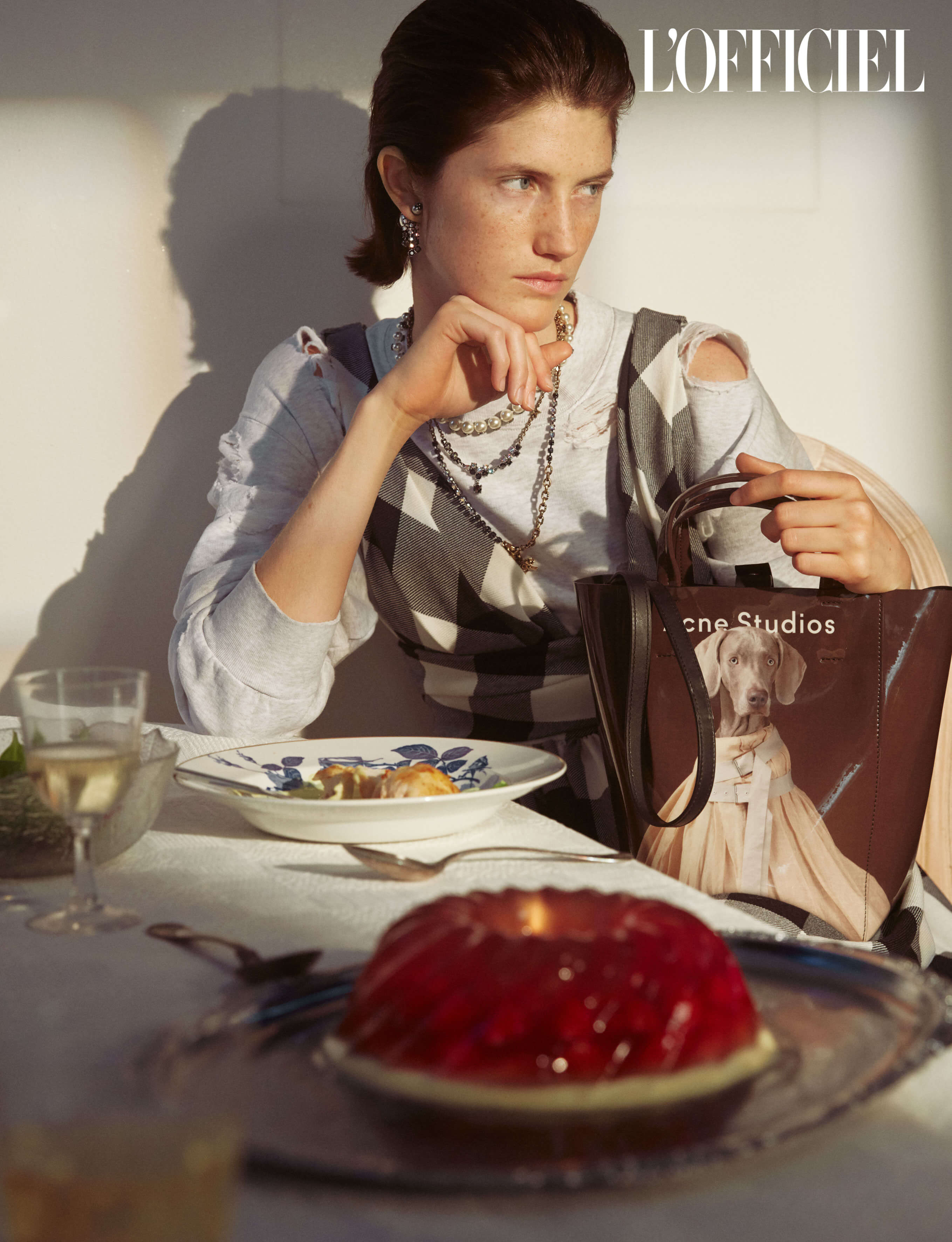 Платье, серьги и ожерелье с кристаллами Swarovski, Christian Dior, свитер Our Legacy, сумка Acne Studios