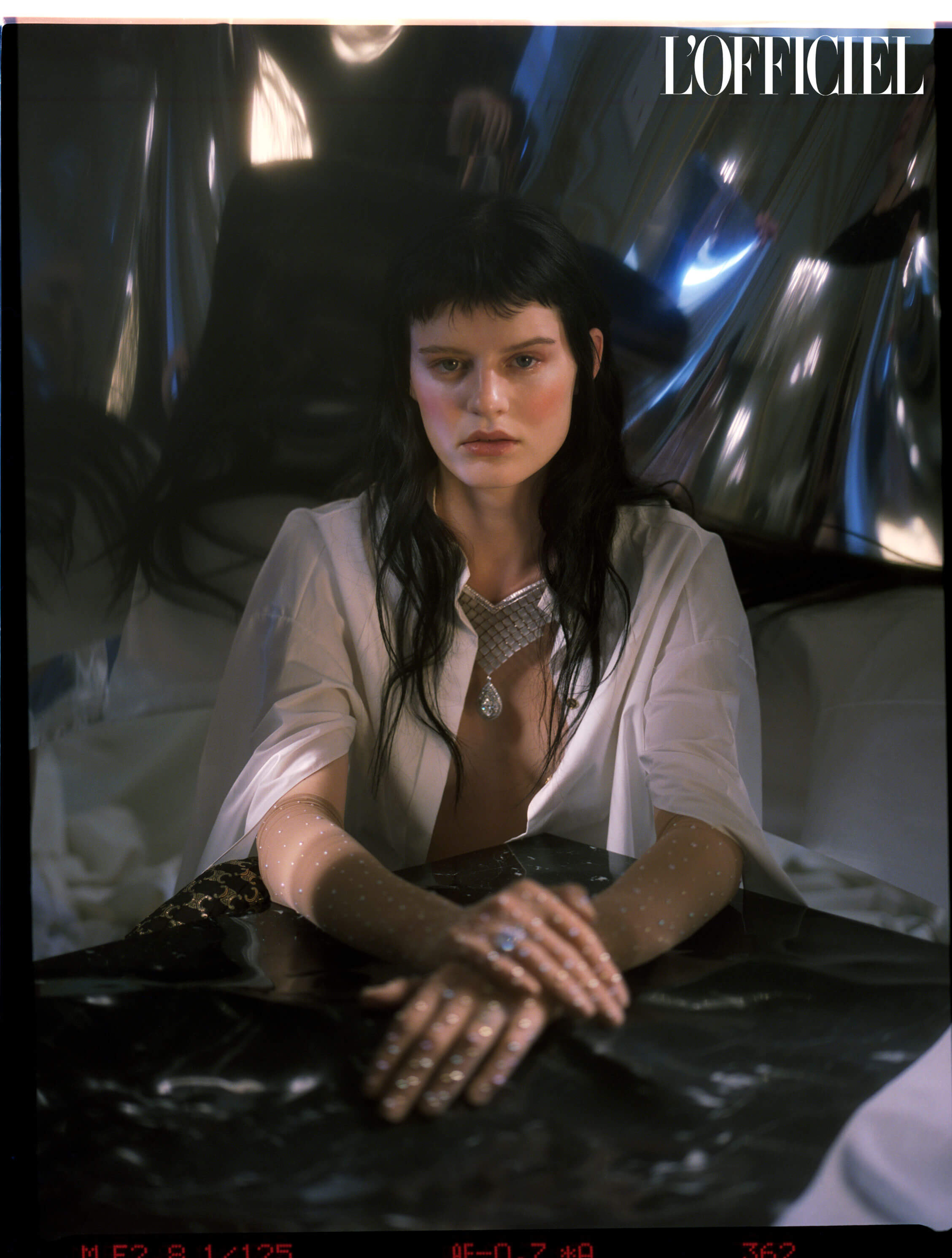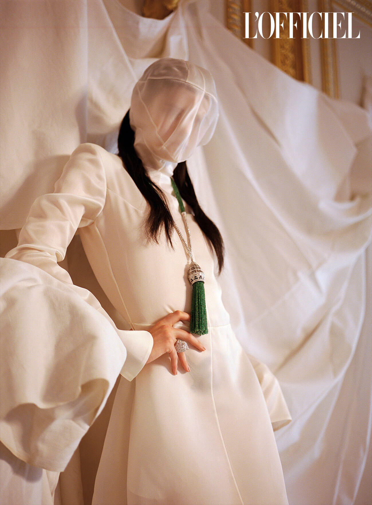Колье-трансформер Paves de Cristal, коллекция Paris, vu du 26, High Jewelry, кольцо Colonne d’Acanthe, Boucheron; рубашка Maison Rabih Kayrouz, перчатки Kuzyomin