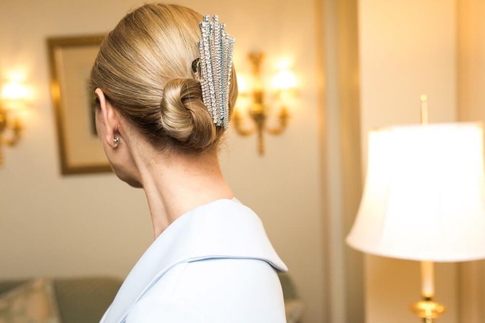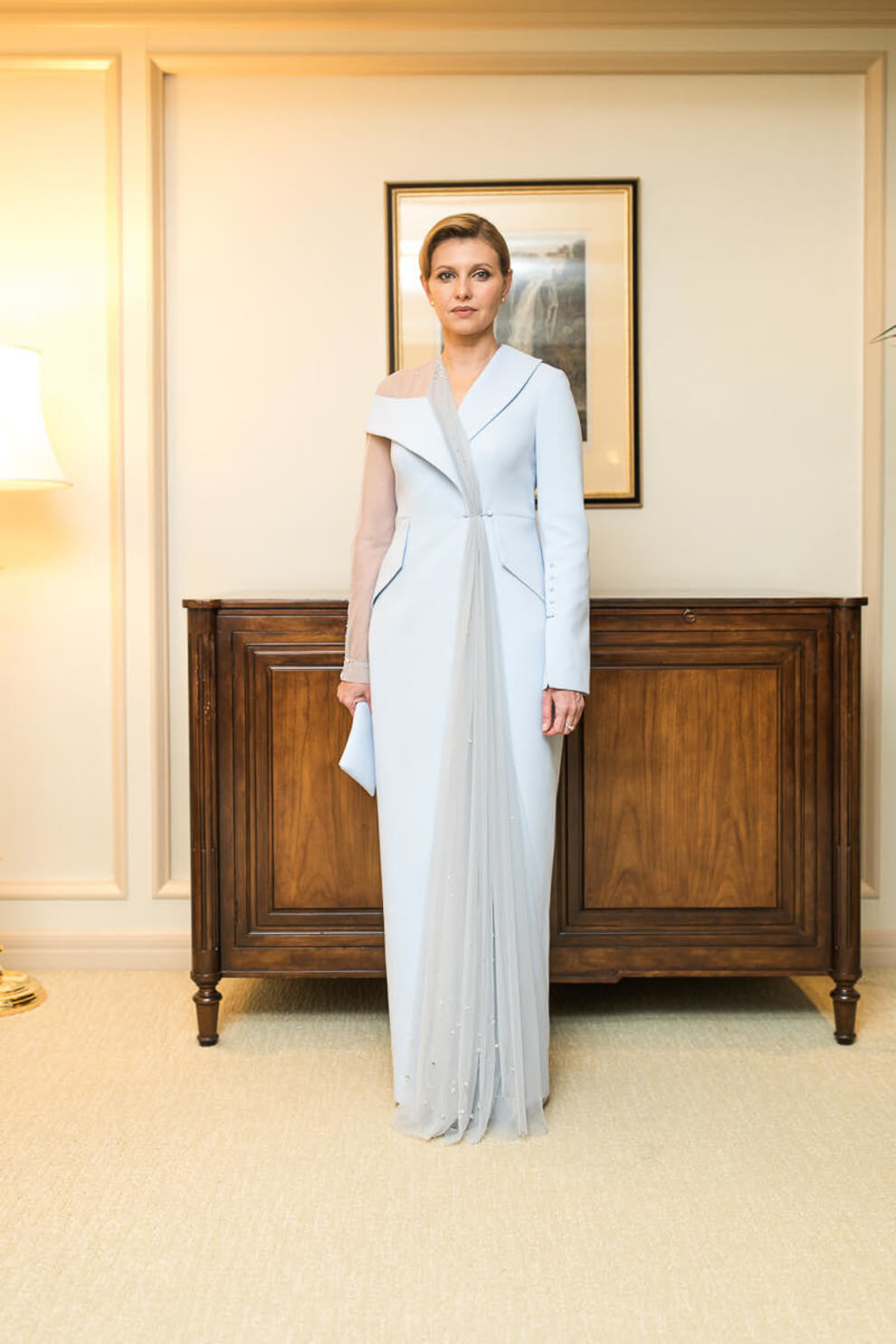Елена Зеленская появилась на вечернем званом ужине в небесно-голубом наряде украинского бренда Frolov. В Японии голубой цвет считается одним из традиционных осенних. Дополняли образ перчатки, кейп и клатч в тон наряду. Волосы жены президента были украшены драгоценной заколкой.