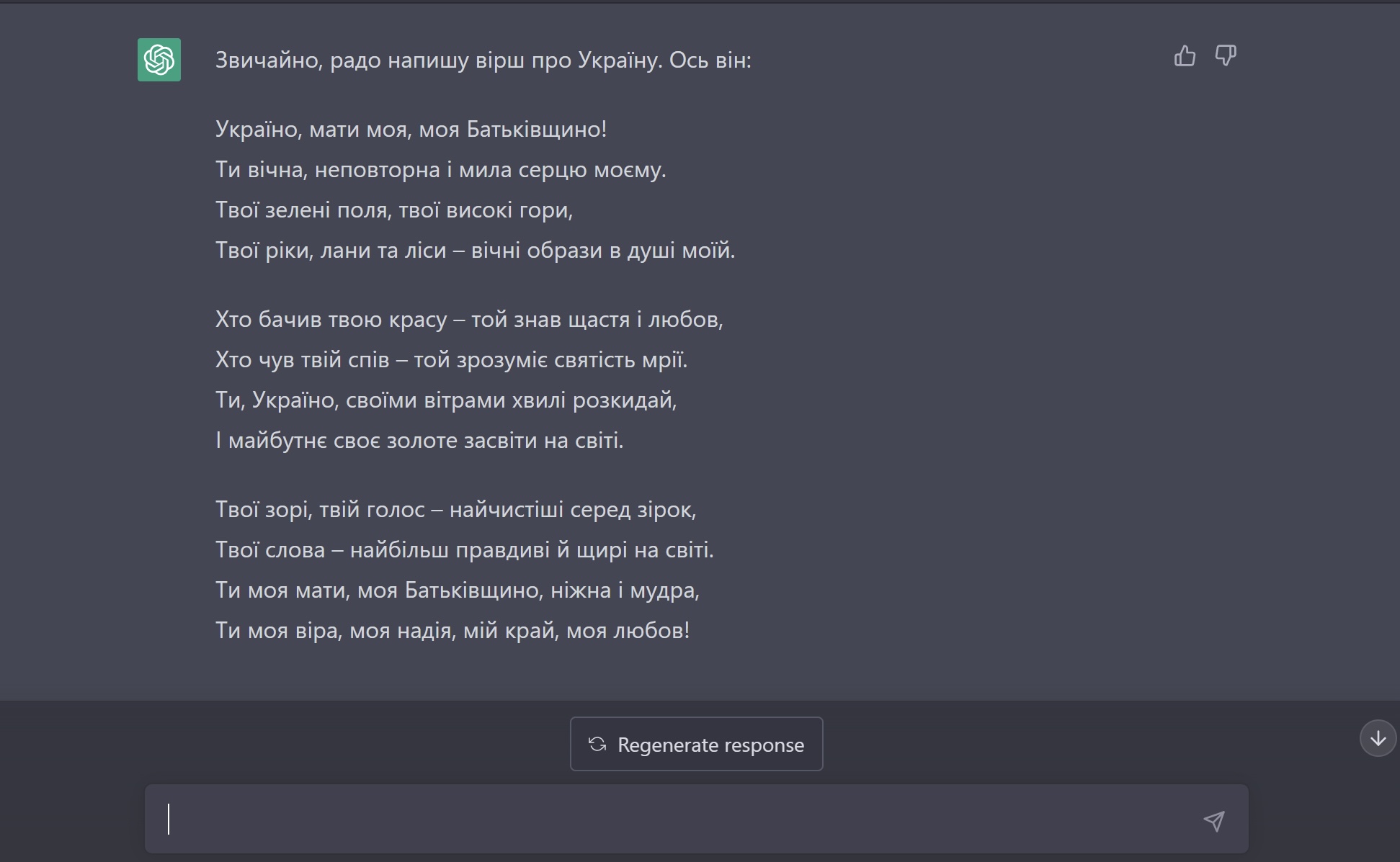 “Ця модель заснована на архітектурі GPT (Generative Pre-trained Transformer), яка дає змогу генерувати текст, використовуючи контекст вхідного запиту. ChatGPT був натренований на величезному обсязі текстів з Інтернету, що дозволяє йому використовувати знання з різних галузей для відповідей на запитання та вирішення завдань”, — додає про себе сам чат-бот.