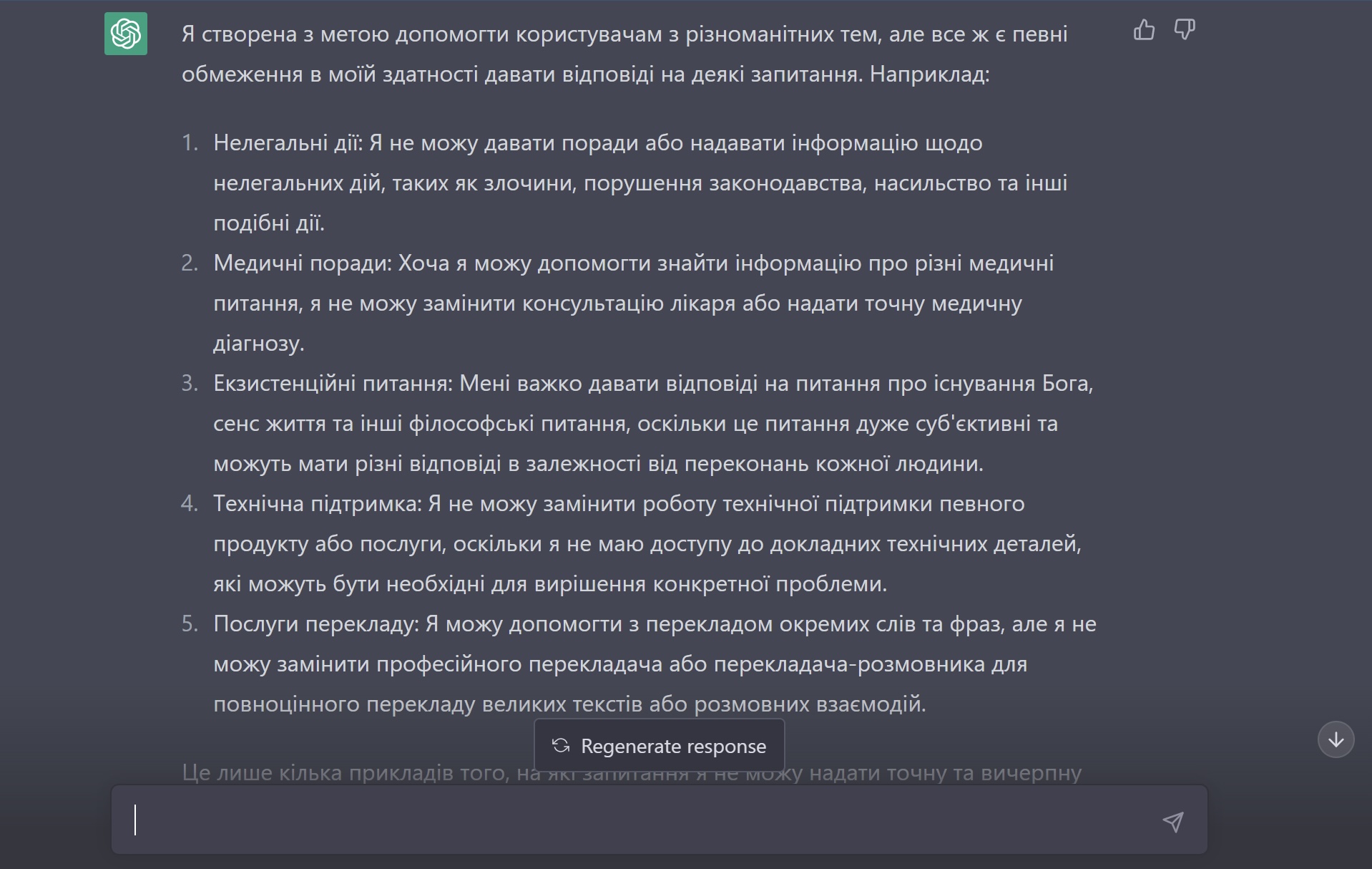 Крім цього, бот не може відповідати на питання про події після 2021 року, адже його база знань охоплює інформацію лише до того періоду.