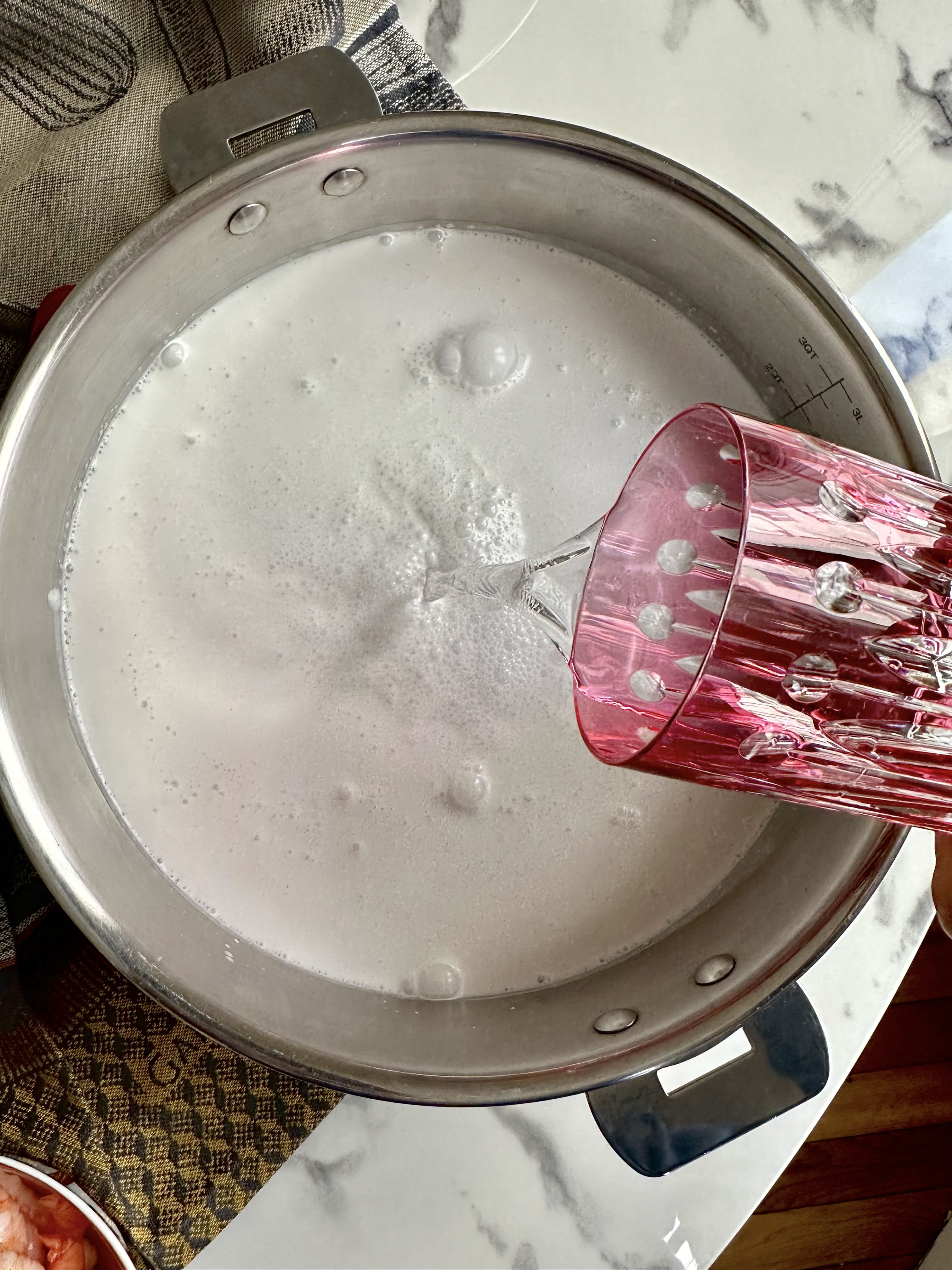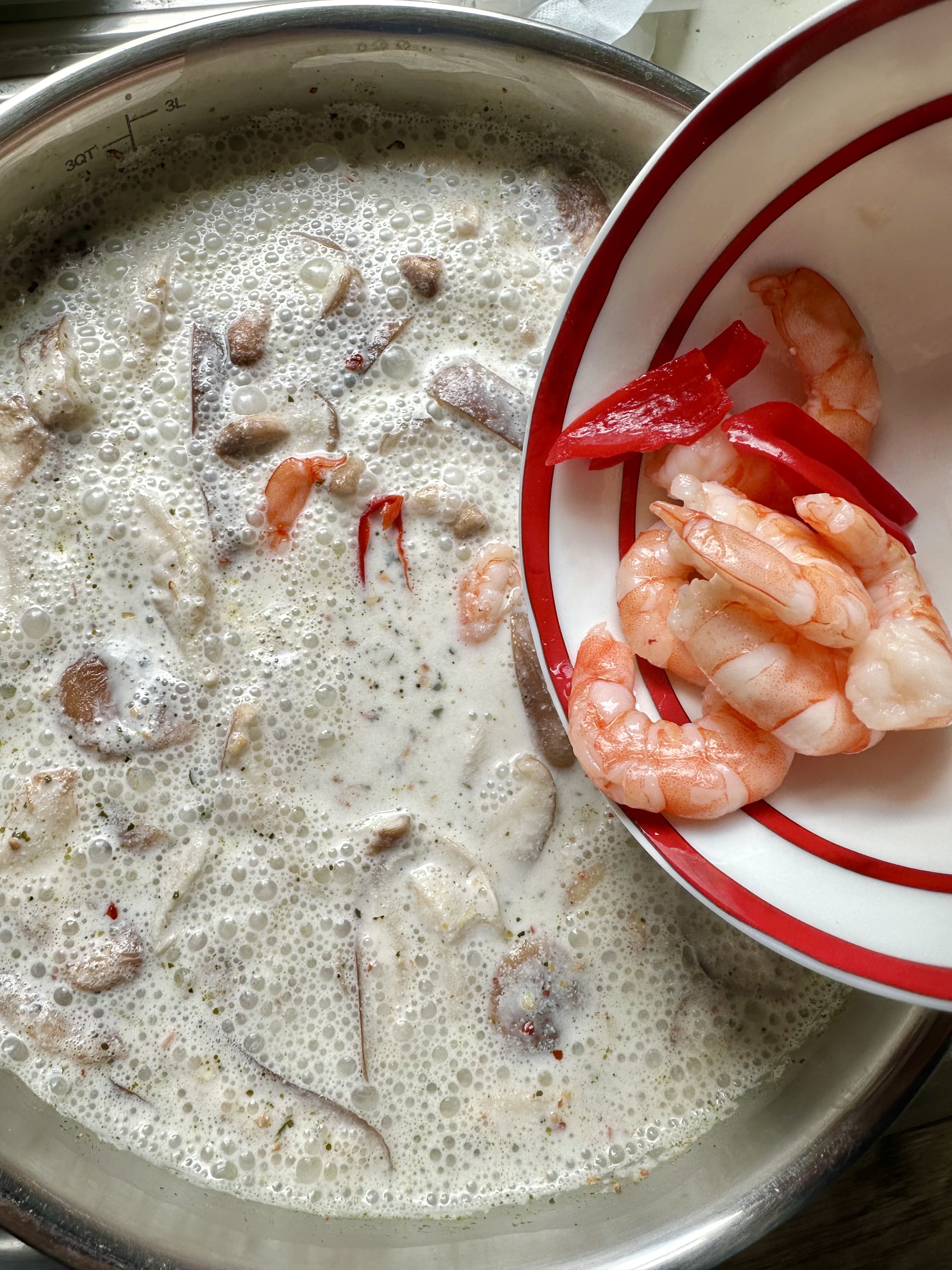 Потім додати креветки, гострий перець, рибний соус, варити ще 5 хвилин.