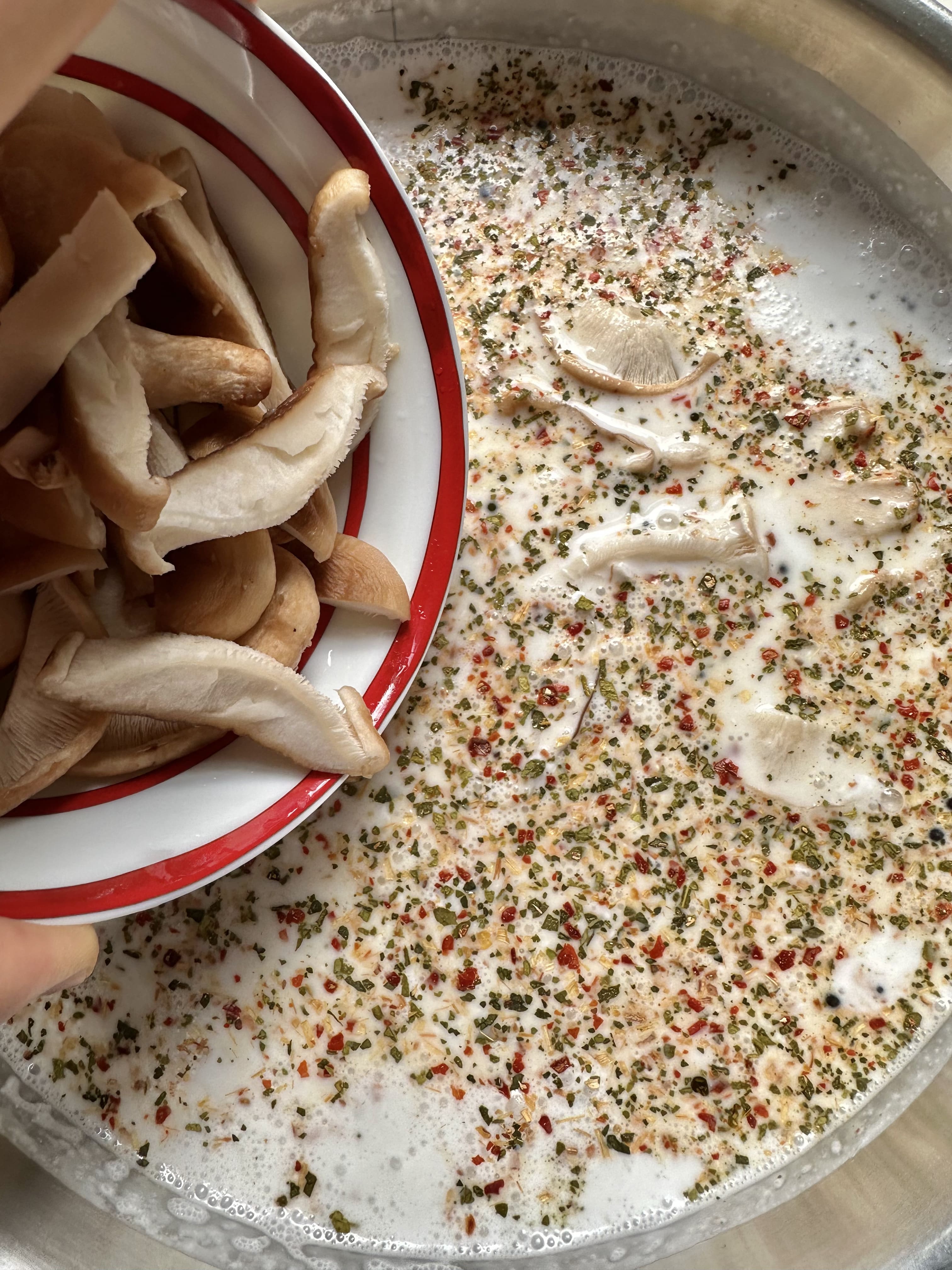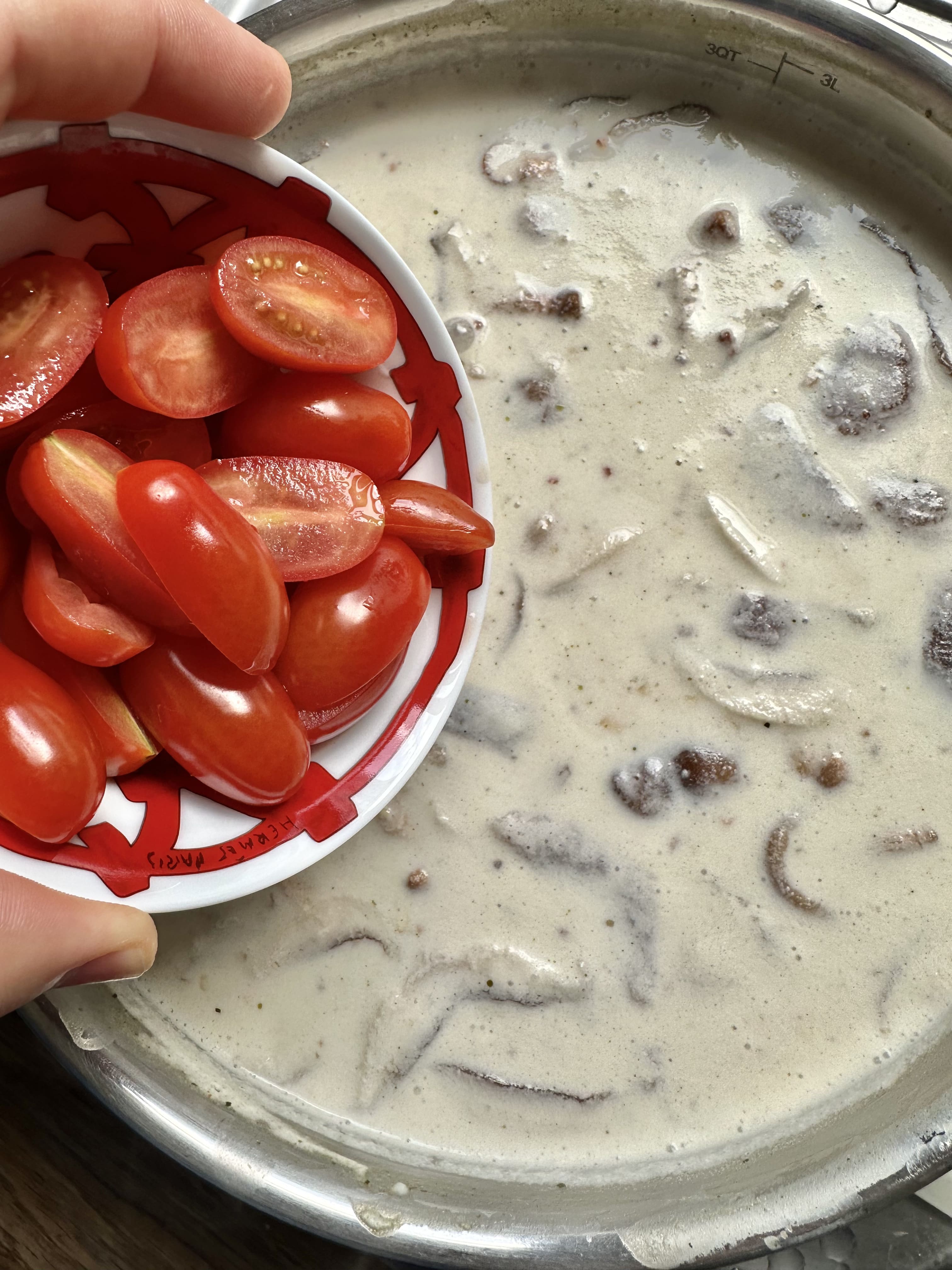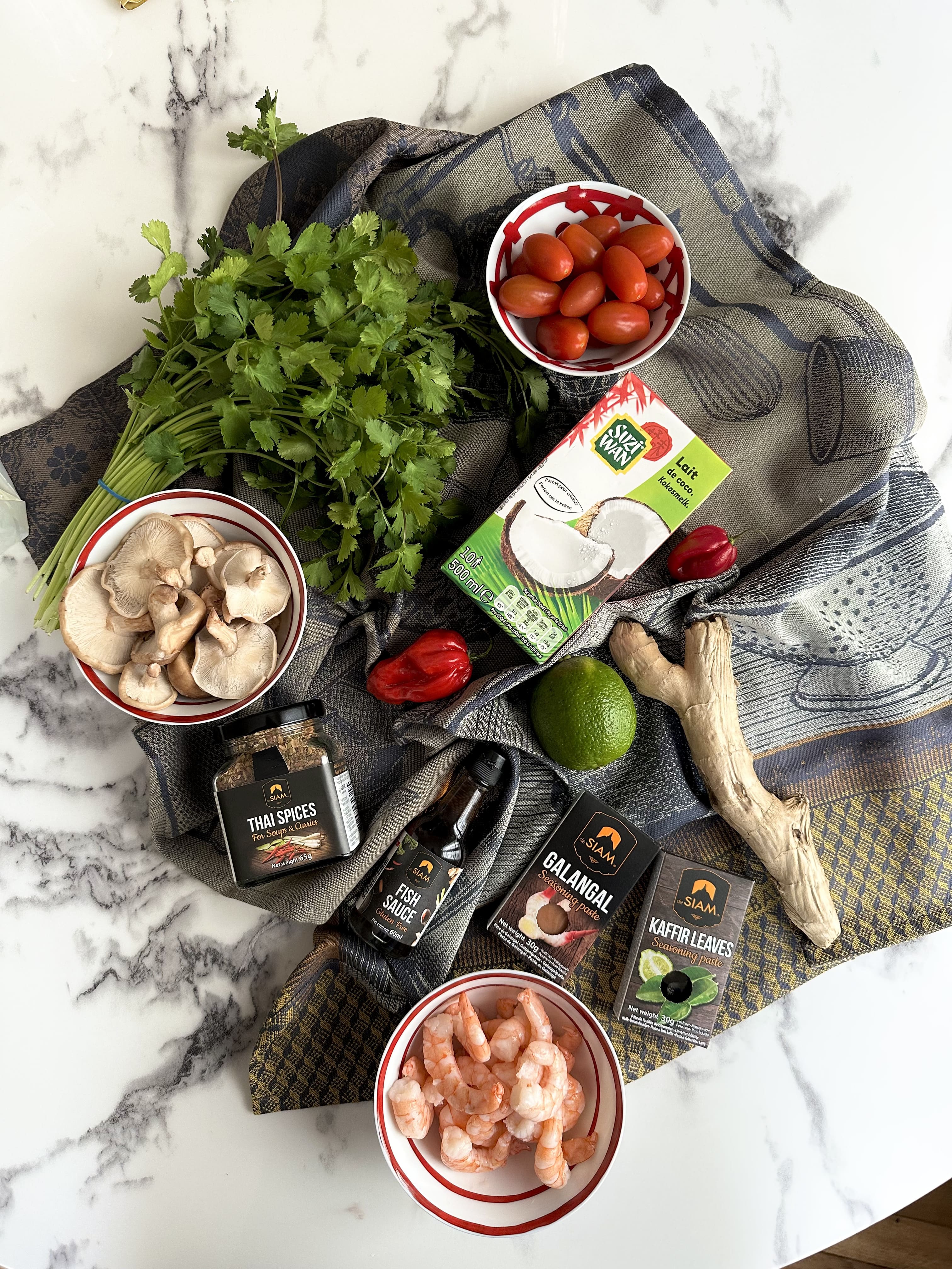 Отже, беремо 1 літр кокосового молока, 1 літр води, 400 г грибів шиїтаке або печериць, дві жмені помідорів чері, 300 г креветок, корінь імбиру, гострий перець, 100 мл тайського рибного соусу, галангал, лемонграс, листя кафiрського лайму, лайм, пучок кiнзи.