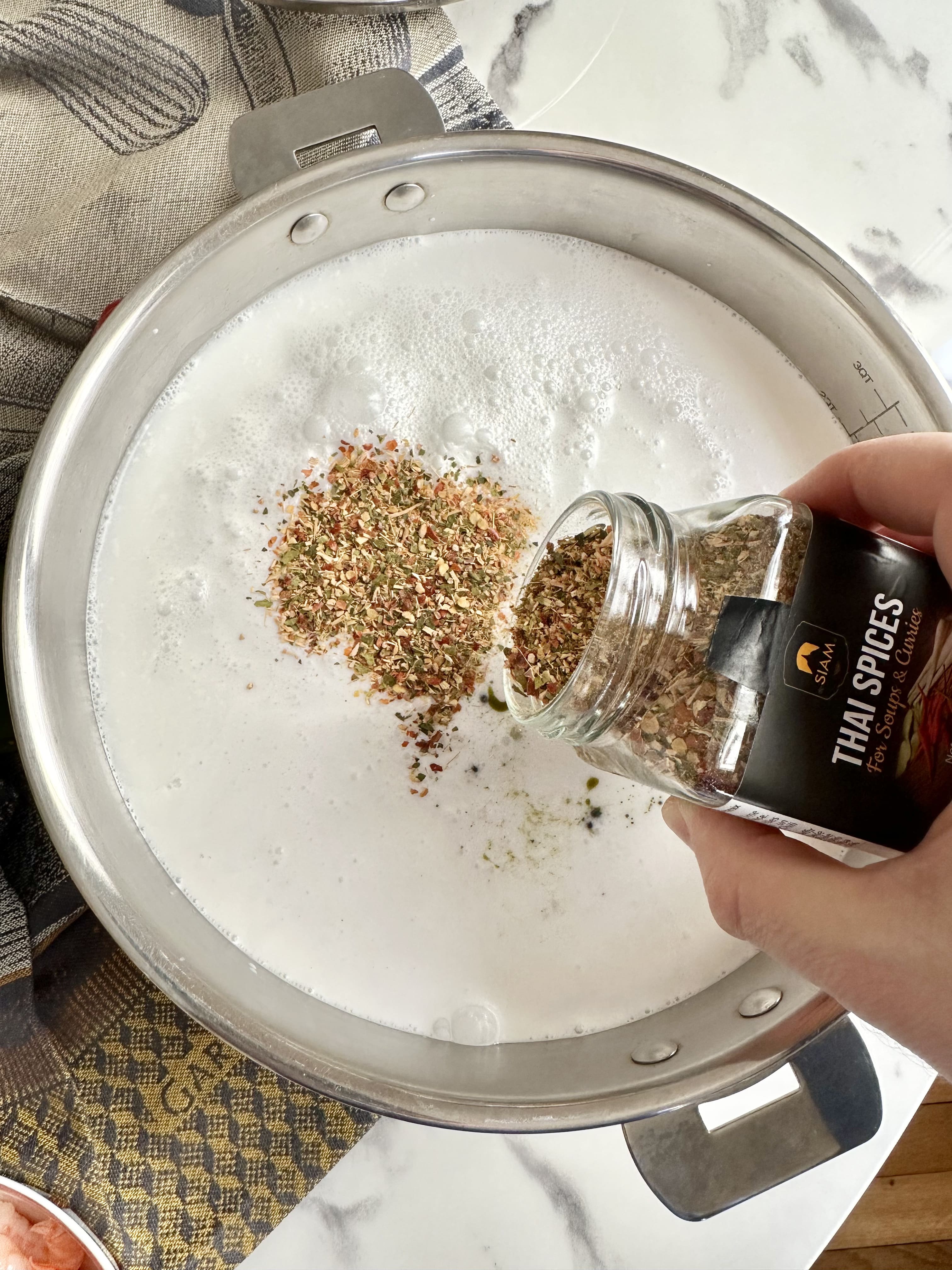 У каструлі змішати воду та кокосове молоко, додати корінь імбиру, галангал, лемонграс, листя кафiрського лайма, відправити на середній вогонь.