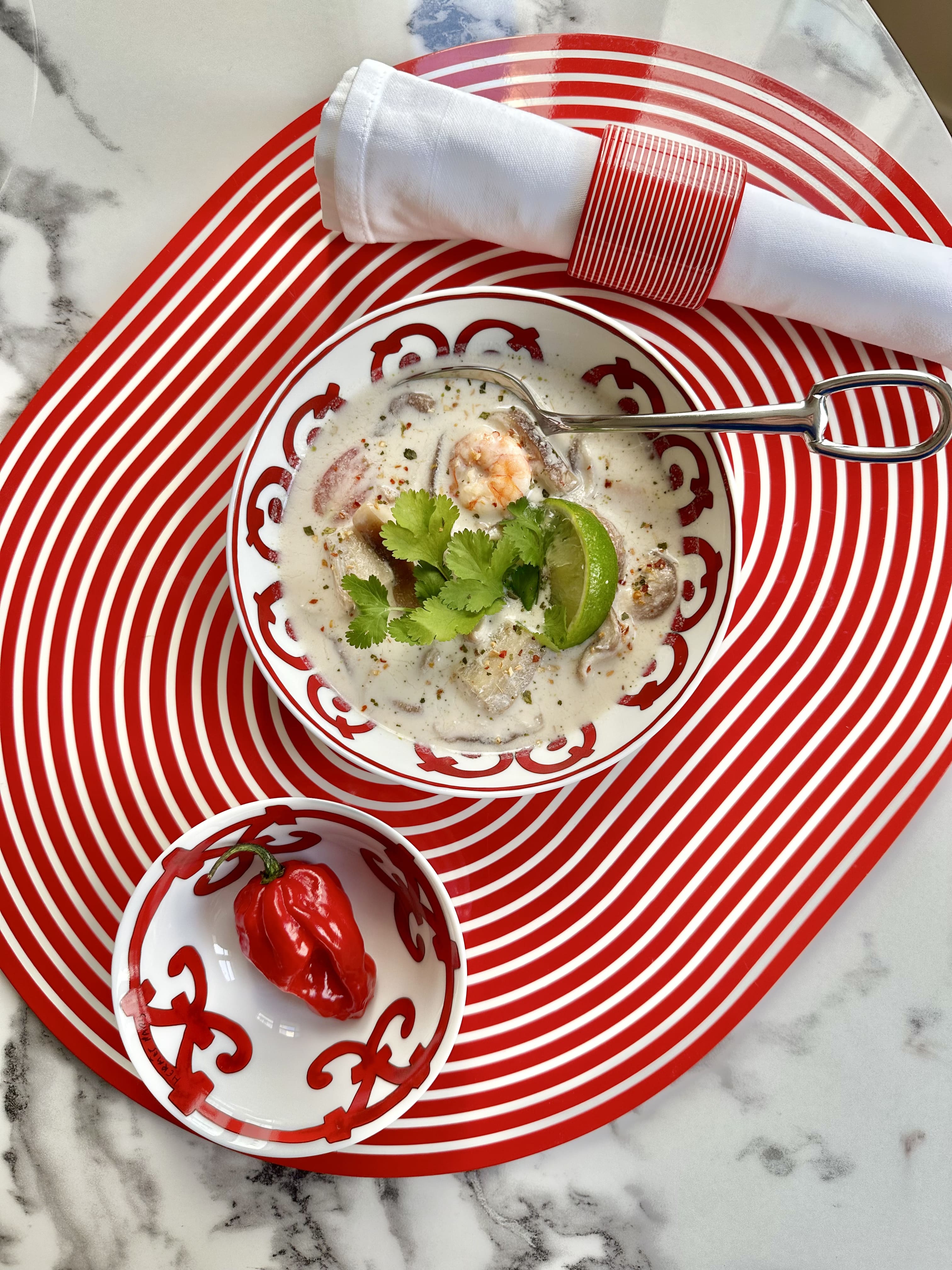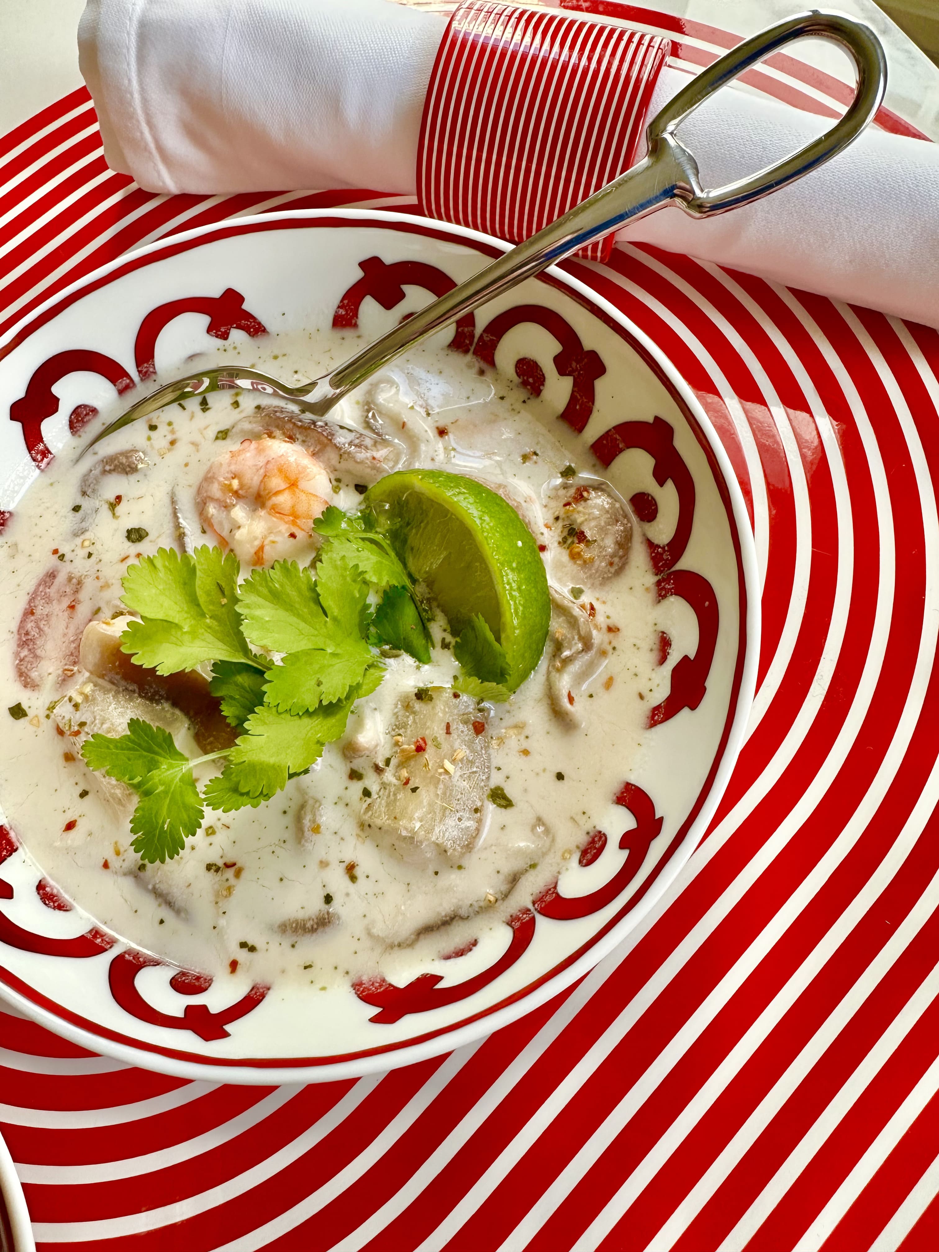 Мій улюблений тайський суп ідеальний для пори, коли не знаєш чого хочеться. Він поєднує всі смаки: гострота чилі, солодощі кокосового молока, солоність рибного соусу, кислота лайма та пряність галангалу, листя кафiрського лайма та стебелю лемонограсу. Не варто боятися страшних назв, усі ці продукти доступні в азіатських відділах супермаркетів.