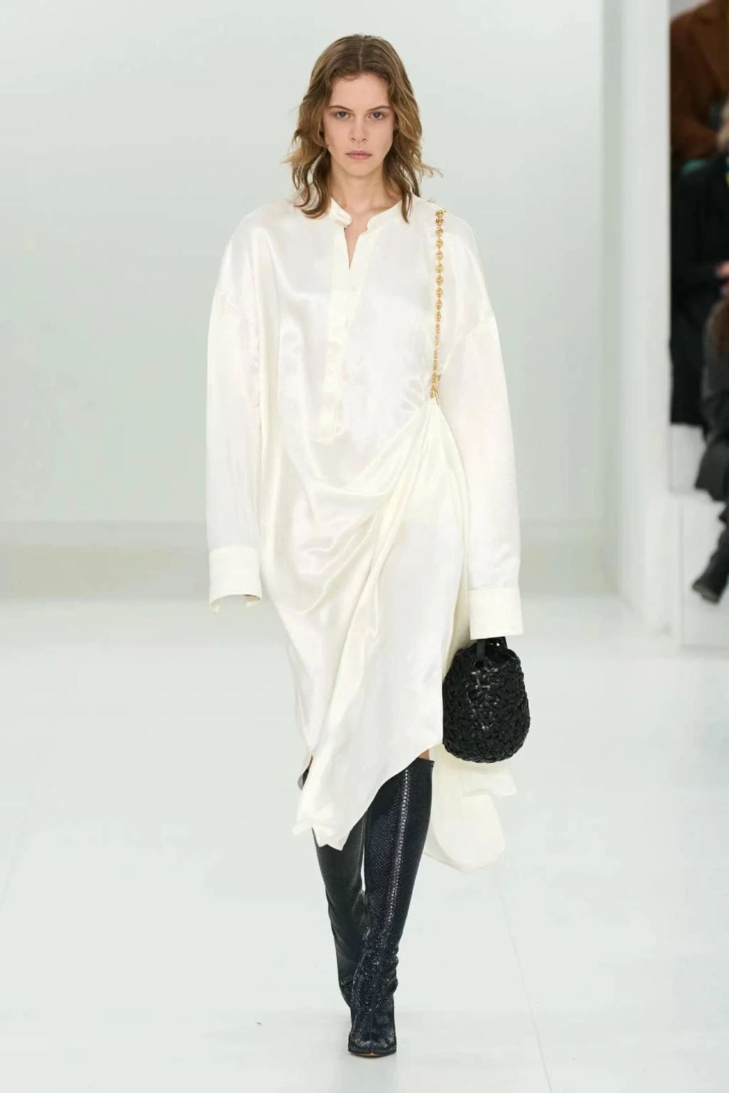 Також зверніть увагу на витончений мінімалізм сукні бренду Loewe у поєднанні з масивним шкіряним взуттям.