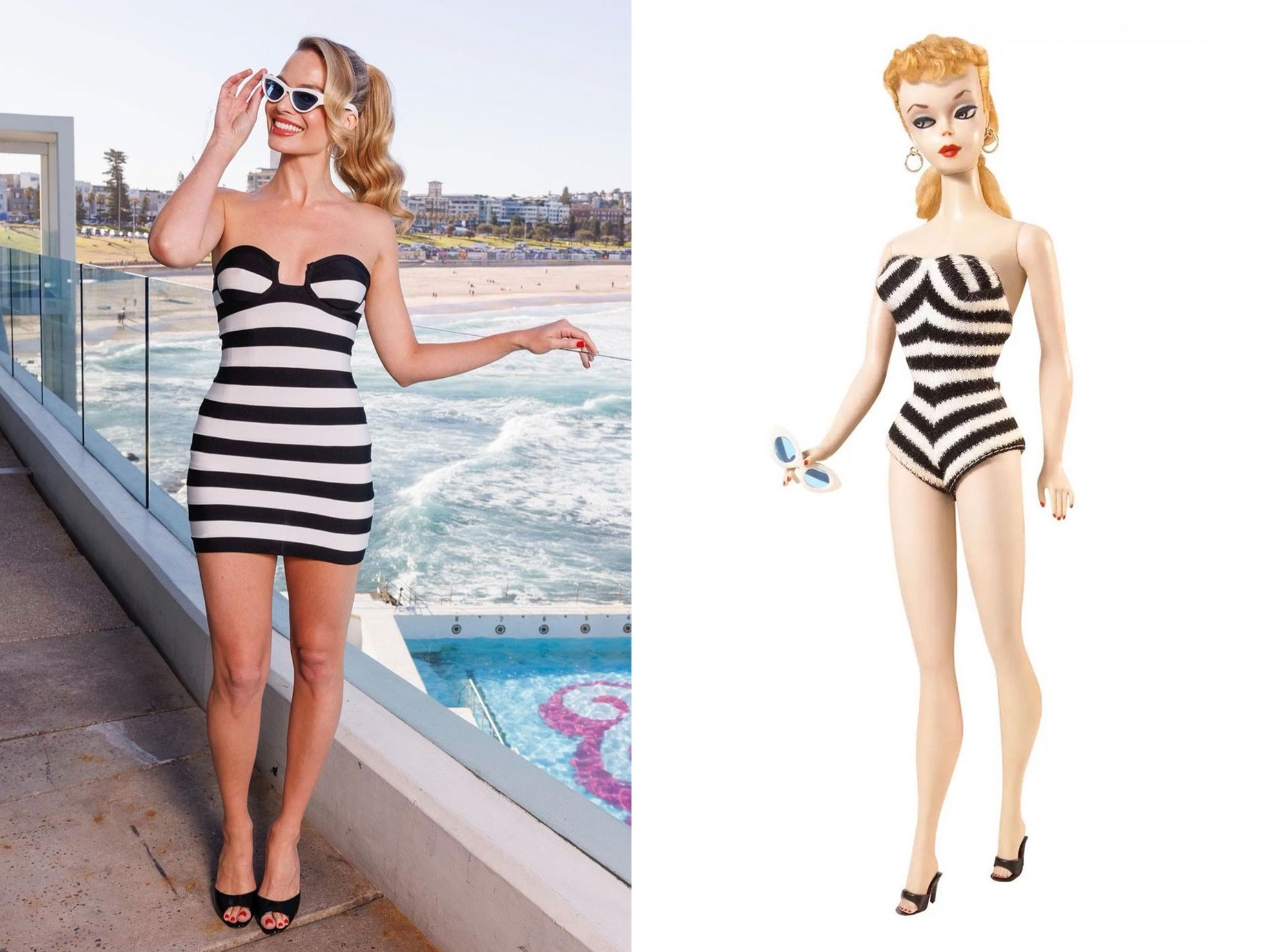 Для створення цього культового образу Swimsuit Barbie 1959 стиліст акторки вибрав чорно-білу сукню від Hervé Legér, доповнивши її парою білих сонцезахисних окулярів з блакитними лінзами від Jacques Marie Mage, сережками-кільцями від Spinelli і парою чорних мюлі на підборах Manolo Blahnik.
