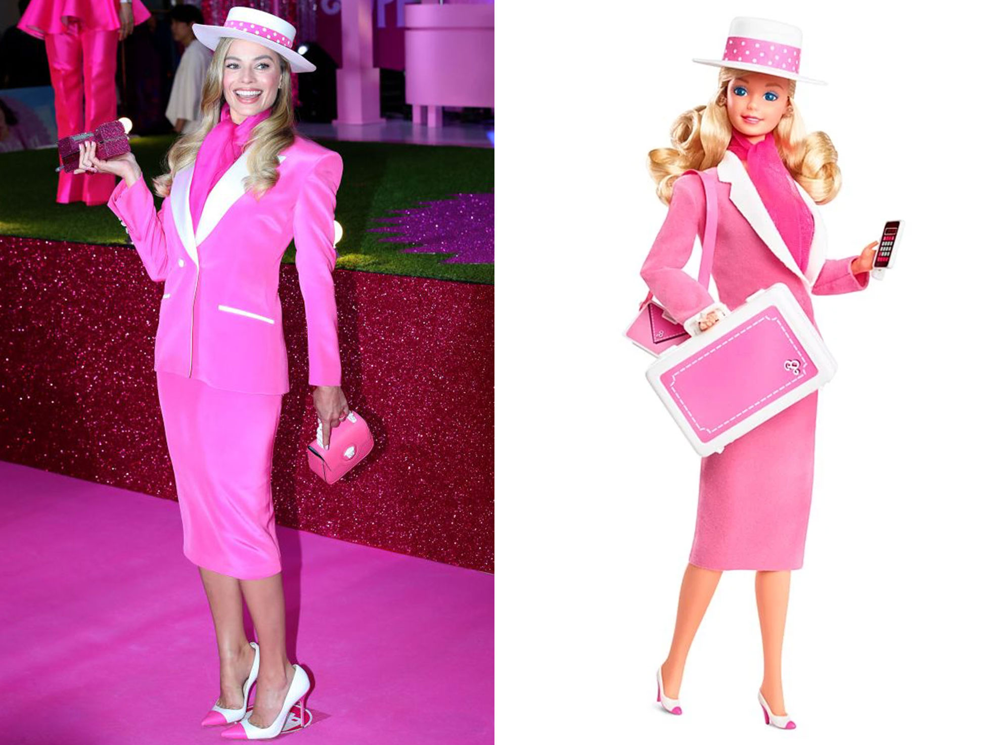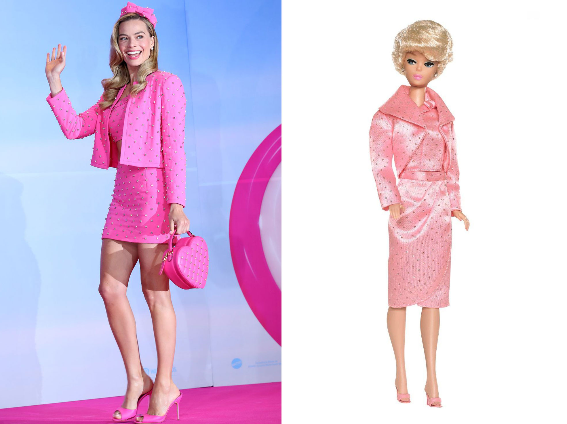 Натхненням для створення цього образу стала Барбі Sparkling Pink 1964 року. Відтворене вбрання ляльки: спідничний костюм Moschino з колекції бренду весна/літо 2015. Марго Роббі одягнула його на прес-конференцію фільму в Сеулі. Завершальними акордами стали характерні аксесуари: капелюх-дот, прикрашений бантом, у тон із мюлі на підборах Manolo Blahnik і відповідний стьобаний гаманець у формі серця.