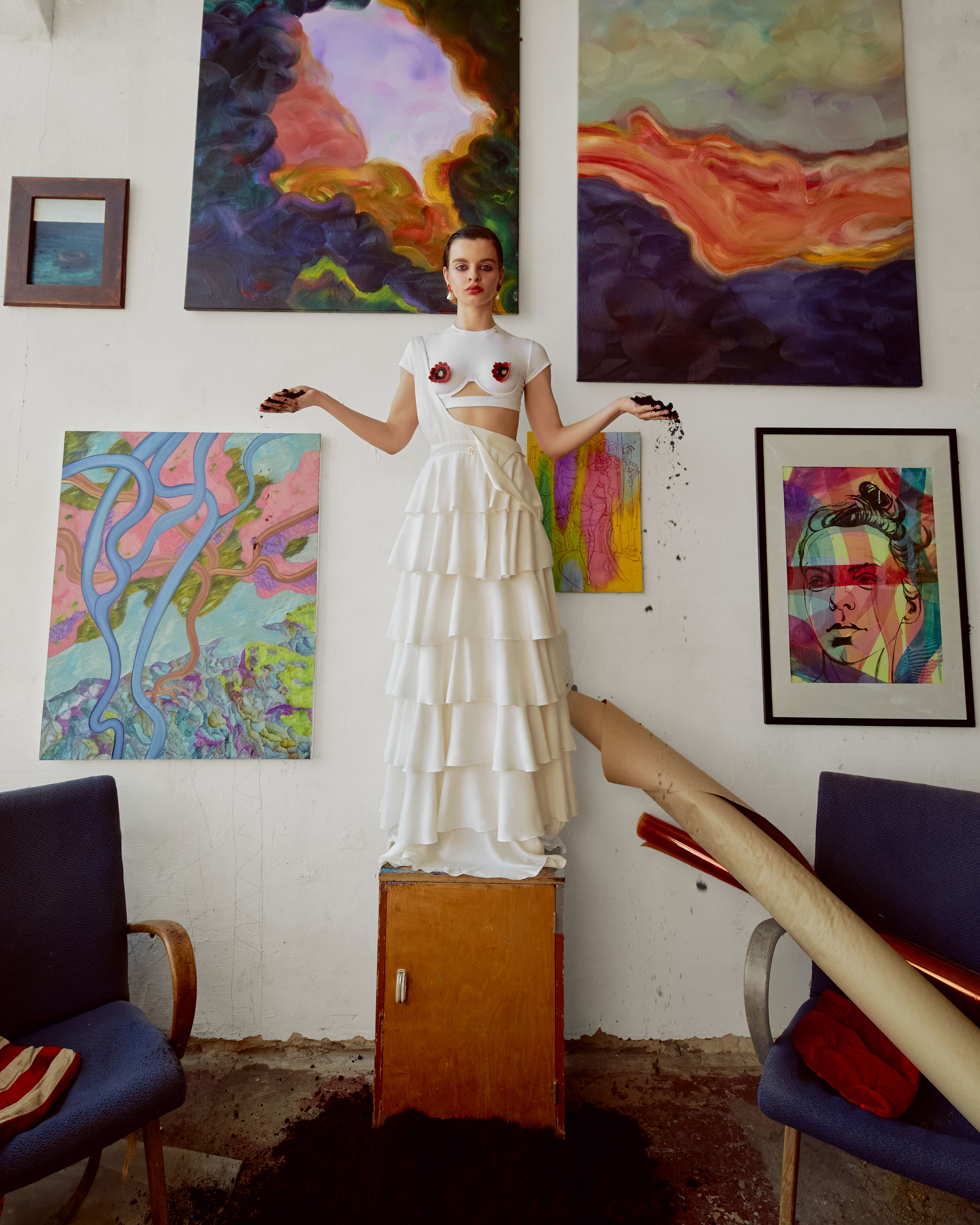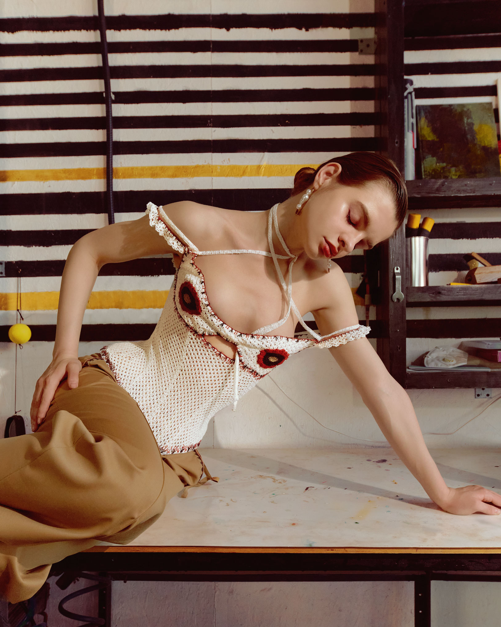 «Ідея створити речі, зв’язані гачком, натхнення давньою технікою «вирізування» – це теж данина моєму дитинству, – розповідає Тоня Белінська. – Моя мама власноруч створювала декоративні елементи для одягу, я могла годинами спостерігати за цим процесом, досі пам’ятаю всі фіранки та оздоблення, які вони з бабусею вишивали. Саме цю легкість і ажурність, які створюються за допомогою давніх технік, що використовувались на території України, я й хотіла передати в колекції».