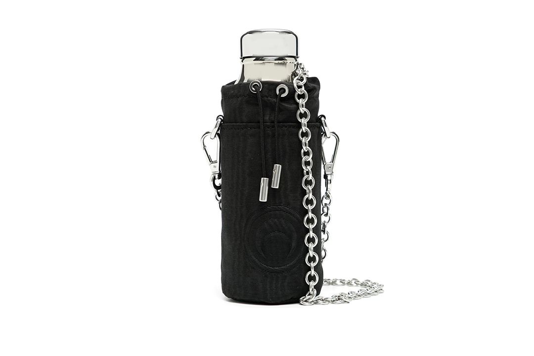 Бренд Marine Serre відомий півмісяцевим принтом на одязі. Цей мотив оздоблює сумку з муаровим ефектом для сріблястої пляшечки. В описі айтему зазначається, що Marine Serre в такий спосіб обирає стильний підхід до зволоження.