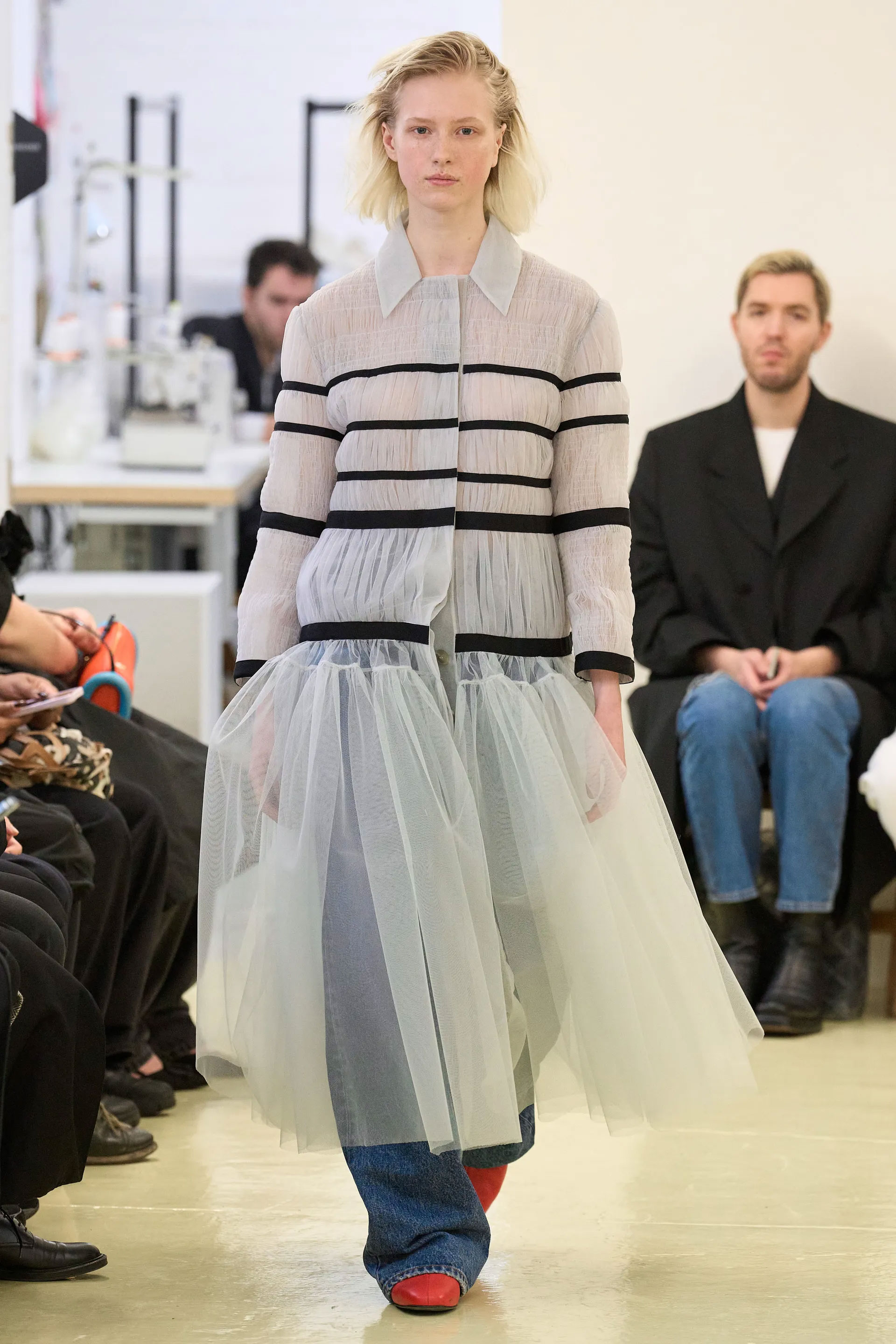 Багатошаровий і легкий ансамбль із денімом наявний у колекції британського бренду Molly Goddard. Модель Афра Вендель демонструє цю комбінацію — повітряний верх поєднується з джинсами.