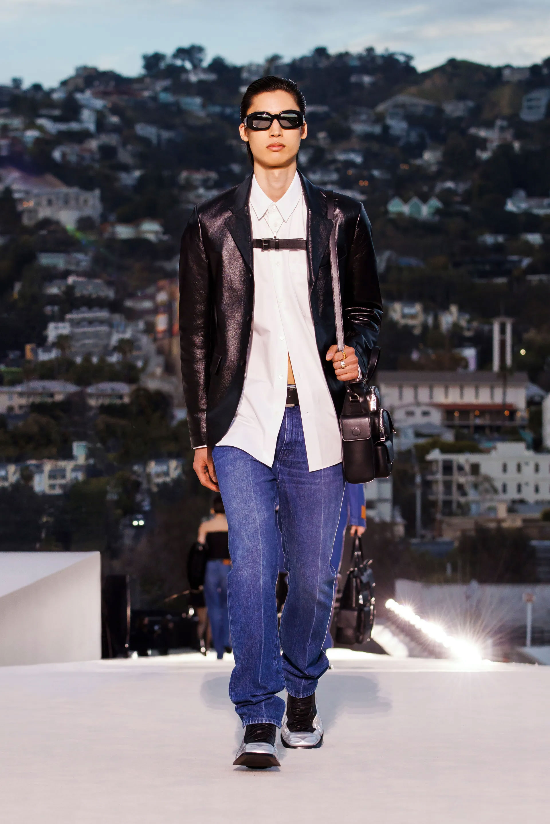 Денім — це важлива частина повсякденного образу. Італійський флагман модної індустрії Versace зібрав образ із базових елементів. Денімова формула складається з білої сорочки, шкіряного верху, а також темних протисонцевих окулярів.