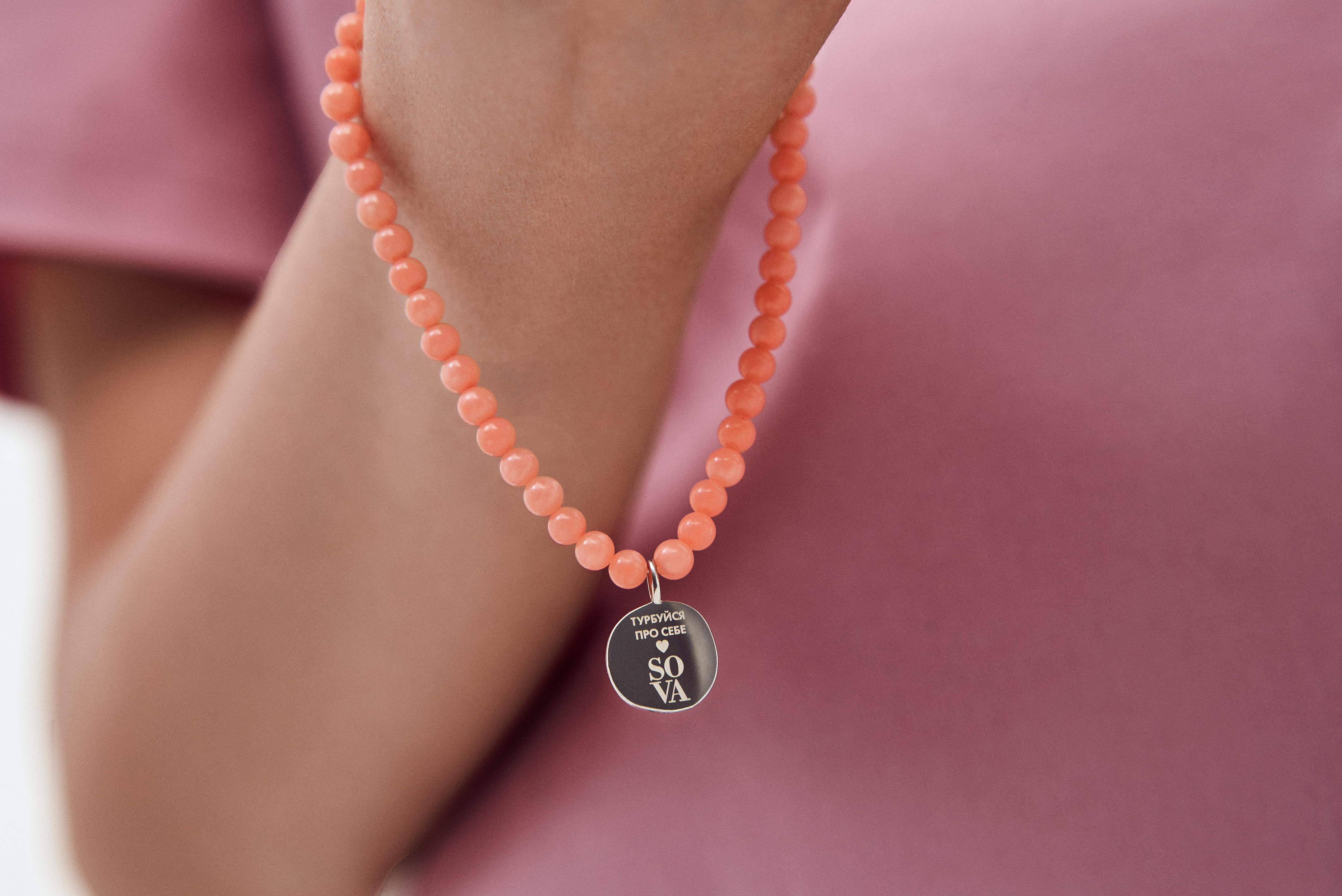 Так з'явився особливий символ, який стане для жінок нагадуванням піклуватися про себе та регулярно перевіряти стан свого здоров’я. Браслет від ювелірного дому SOVA виконаний з ніжного рожевого коралу, доповнений срібною підвіскою з емаллю, де символічно зображені жіночі груди, а на звороті вигравіюване нагадування  — «турбуйся про себе». Цей символ стане для жінок нагадуванням піклуватися про себе та регулярно перевіряти стан свого здоров’я.