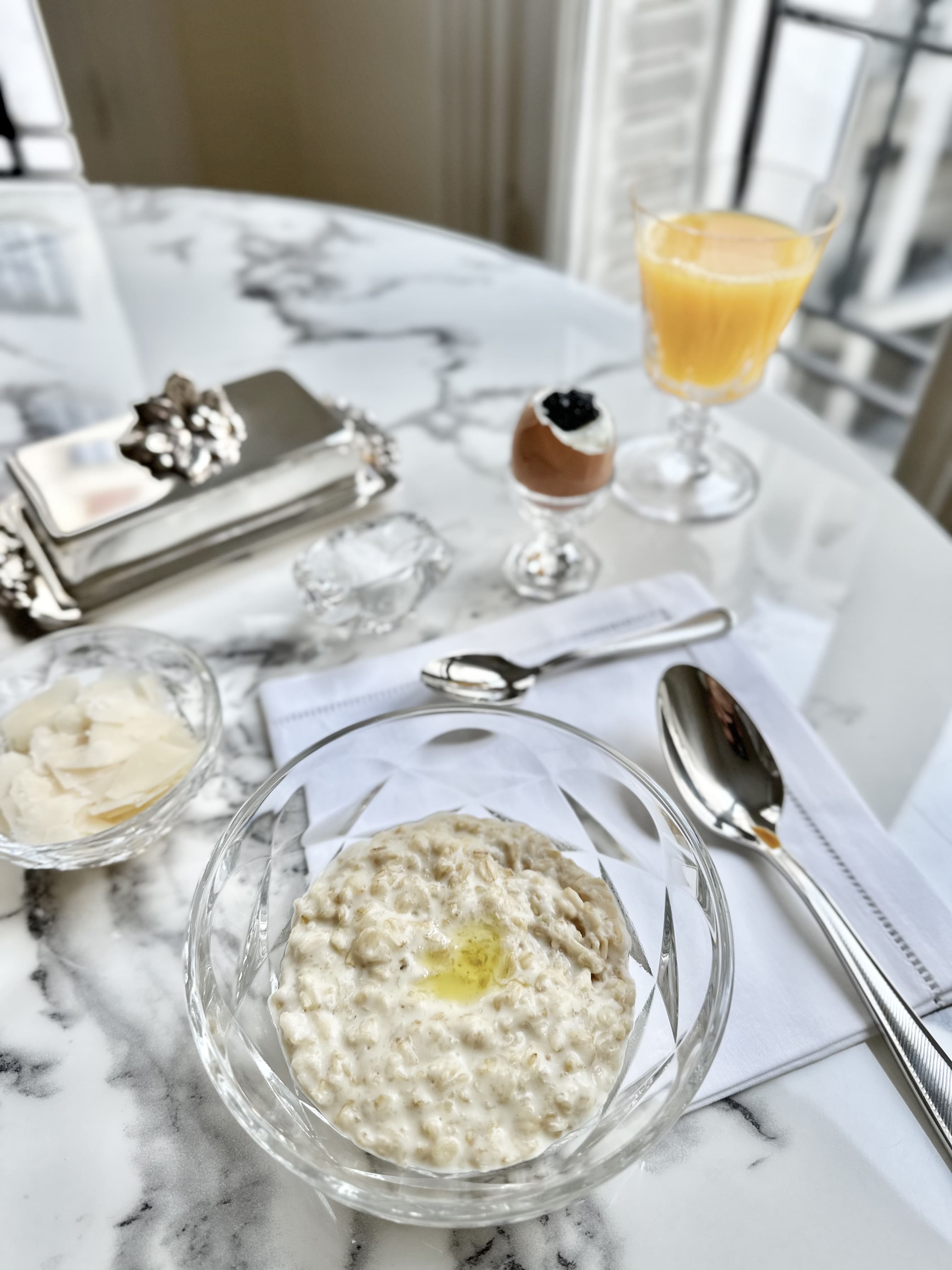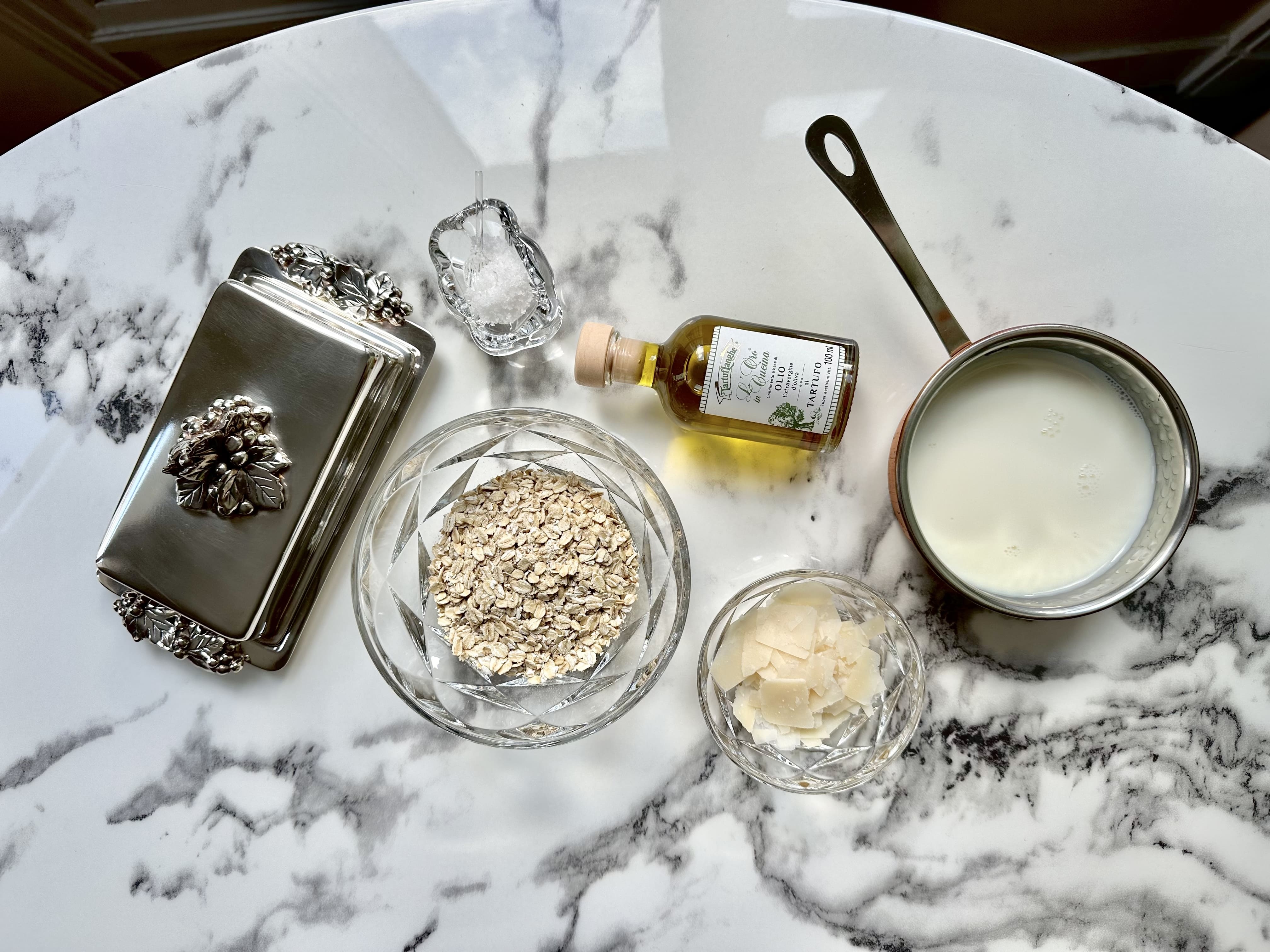 Отже, на одну порцію беремо: 3 столові ложки вівсяних пластівців із гіркою, 230 мл молока, щіпку солі, 20 г пармезану, чайну ложку трюфельної олії.