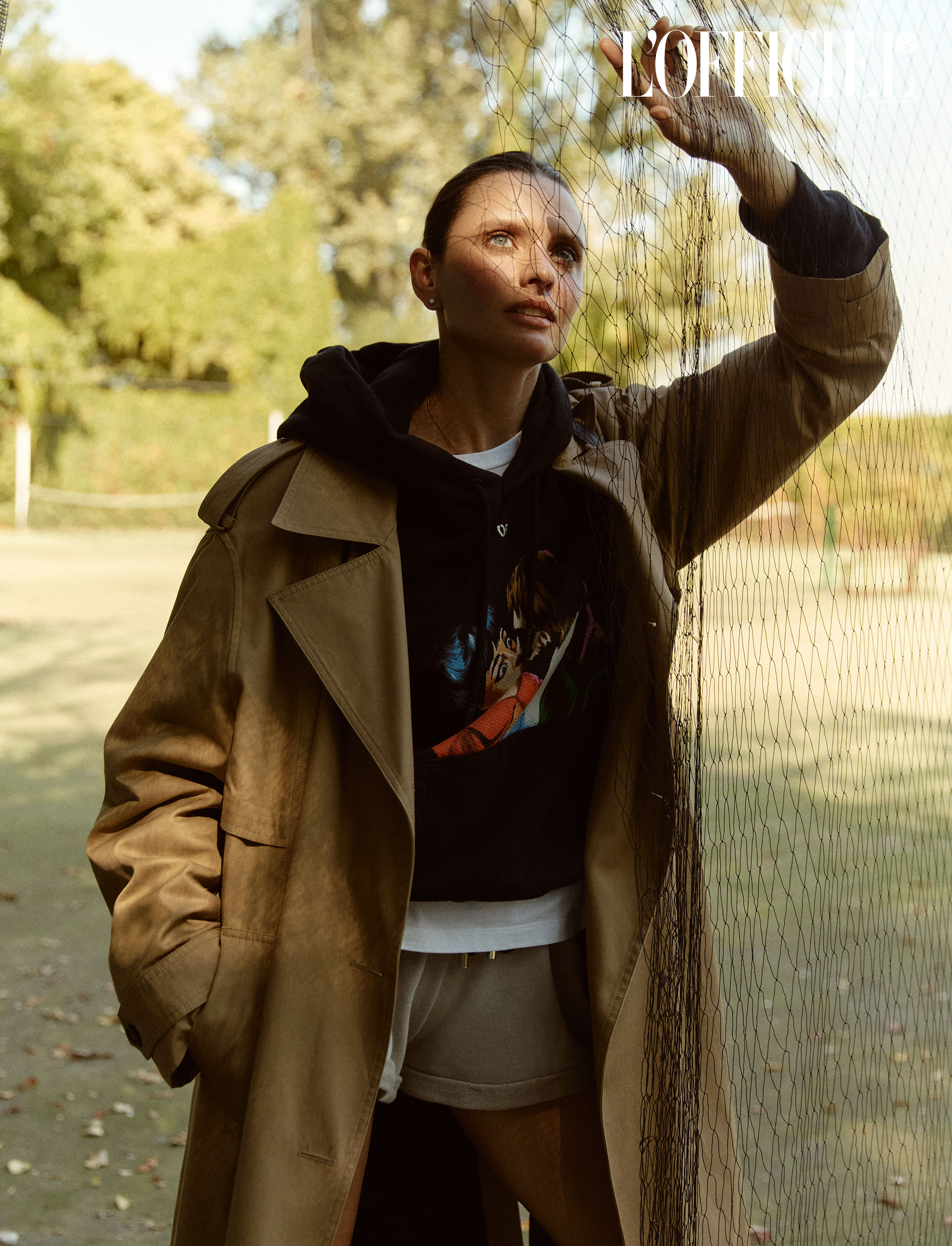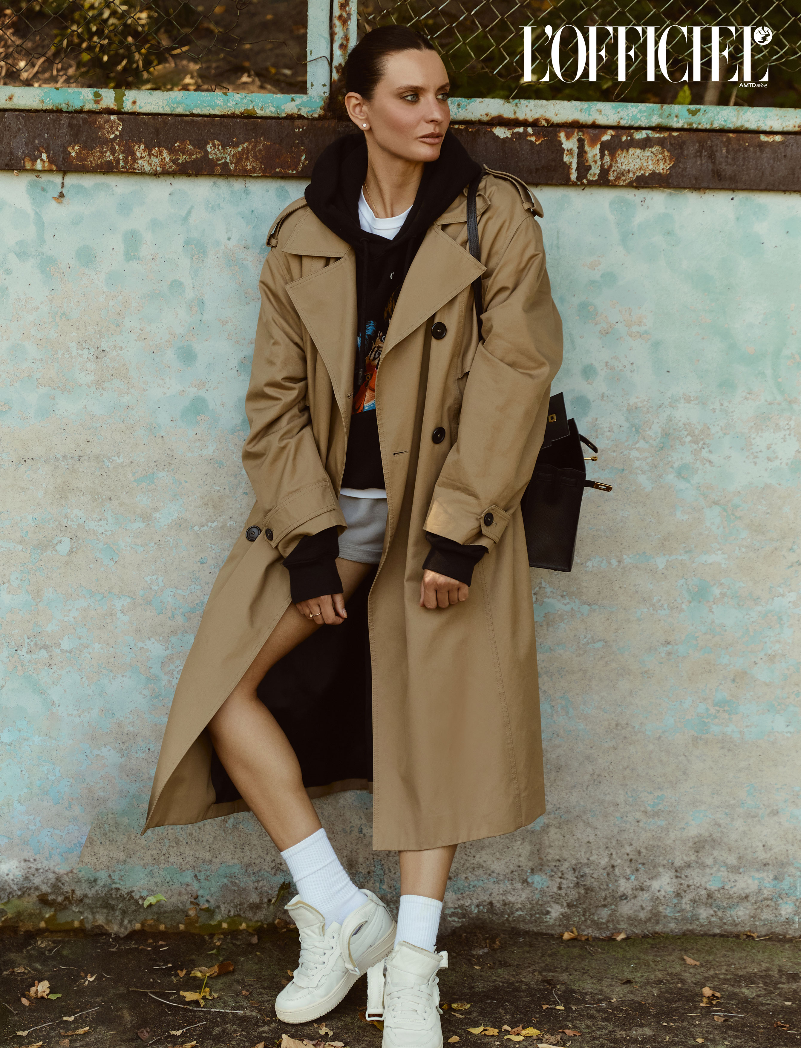 Тренч, Saint Laurent; худі, Off-White; футболка, Acne Studios; шорти, Mood Stories; шкарпетки, VIL’NA clothing; снікери, Nike x Comme Des Garçons; сумка, Hermès, пусети, Graff; каблучка, Cartier
