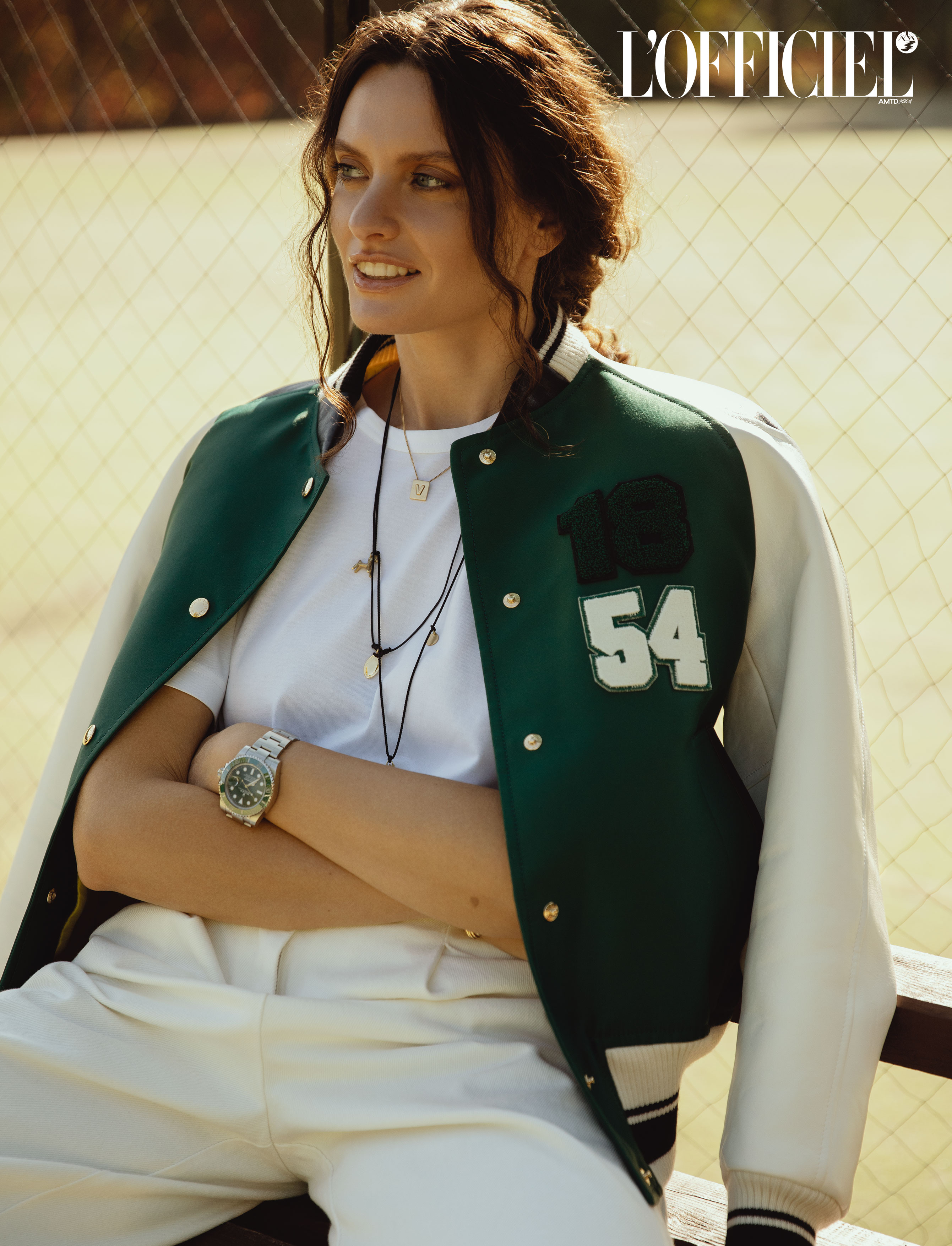 На Віолі: бомбер та снікери, Louis Vuitton; футболка, Stella McCartney; джинси, Toteme; шкарпетки, VIL’NA clothing; годинник, Rolex; браслет, Lutiki; ланцюжок з літерою V, Céline; кольє з кониками, Katimo