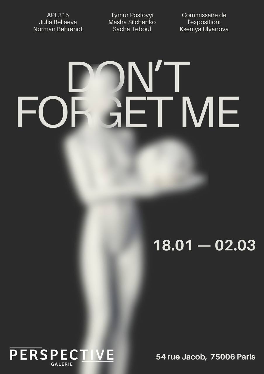 З 18 січня по 2 березня в парижській Perspective Galerie відбудеться експозиція "Не забувай мене", що об'єднує твори шести художників, з яких чотири — українці. APL315, Юлія Беляєва, Маша Сільченко, Тимур Постовий, а також Норман Бренедт та Саша Тебул представлять роботи з абсолютно різними формами: скульптура, фотографія та живопис.