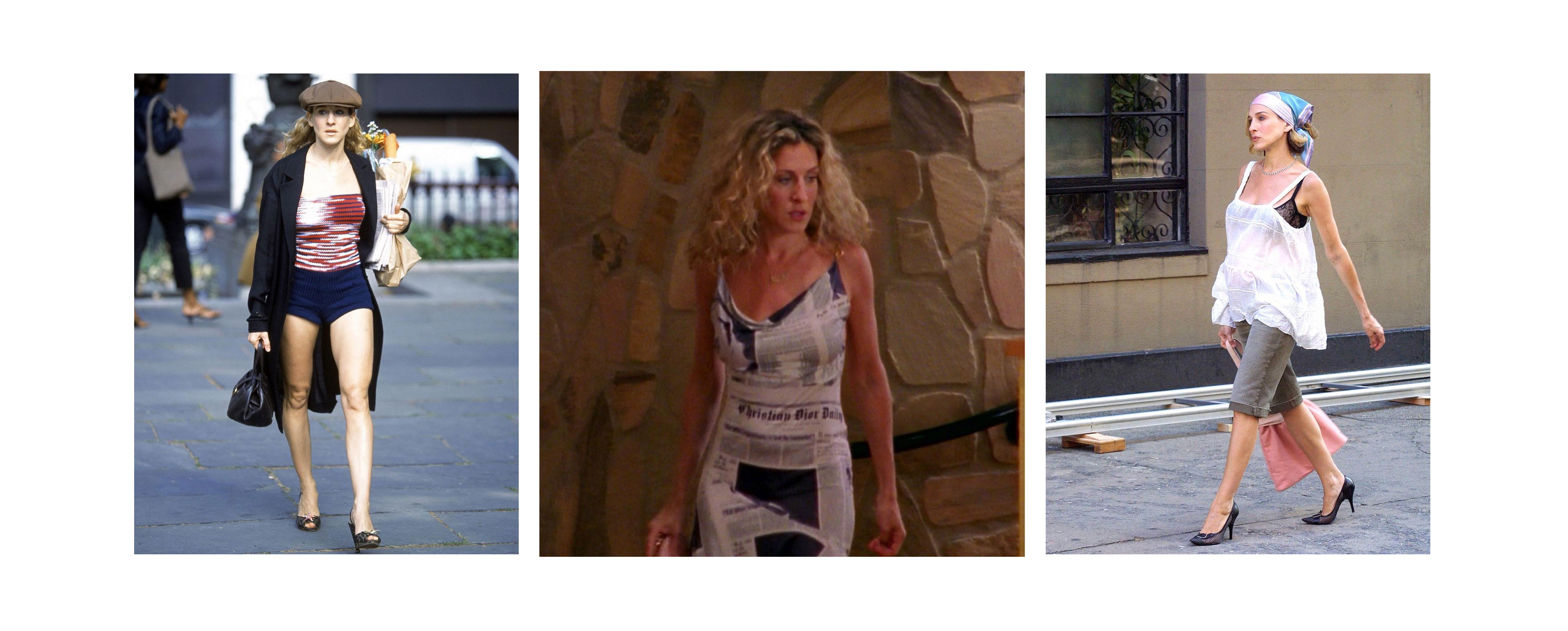 Наступний образ Керрі Бредшоу знову творить історію попкультури. Йдеться про газетну сукню Christian Dior від Джона Гальяно з колекції осінь-зима 2000/2001, в якій героїня з’явилася в сімнадцятому епізоді третього сезону. Ціна цього культового вбрання досягала десятків тисяч євро на продажах, а його оформлення дало поштовх утворенню окремого принтованого стилю.