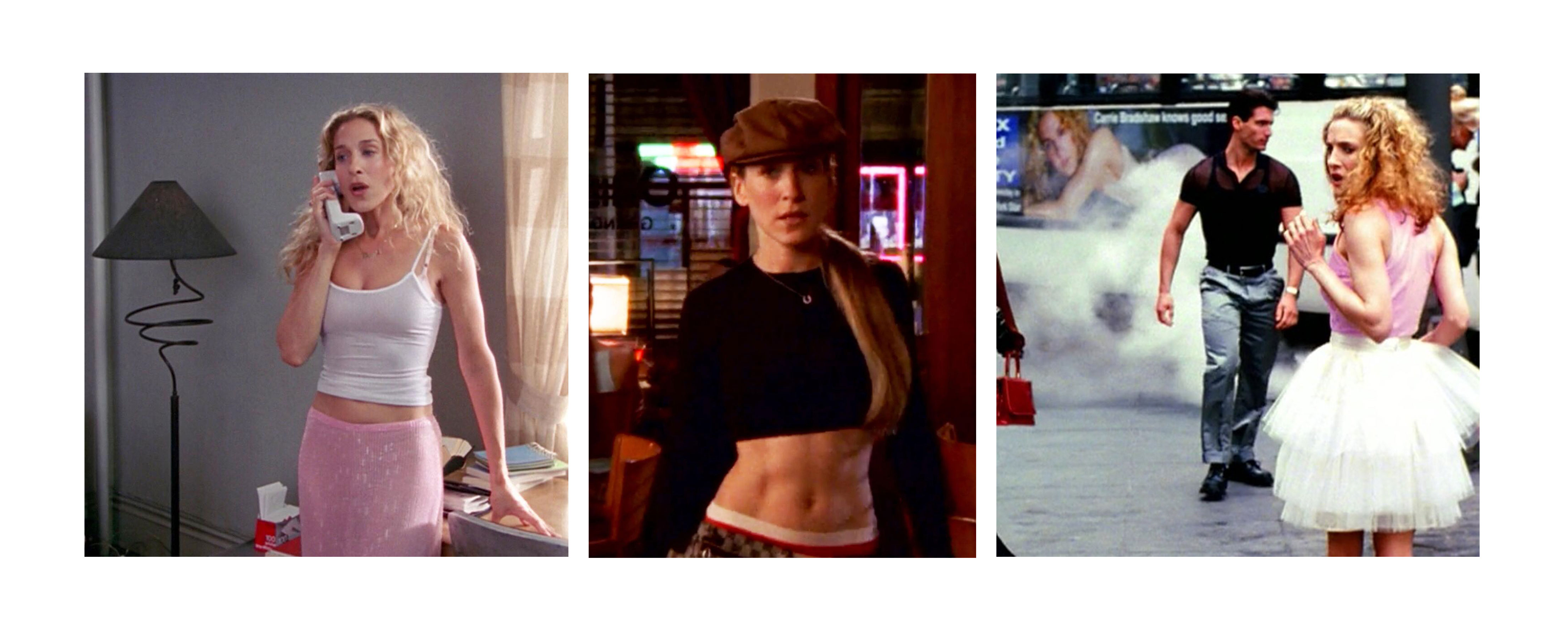 Заразом у сьомому епізоді четвертого сезону Керрі Бредшоу з’являється в знаковому образі, для якого стилістка серіалу Патриція Філд надихалася ансамблем із колекції Prada весна-літо 2001. Героїня постає перед глядачами в смугастій мідіспідниці із низькою посадкою, чорному кроп-топі, доповненому намистом у формі підкові та поясною сумкою Gucci. Якщо ви вже складаєте мудборд для літніх коктейльних вечорів, обов’язково зверніть увагу на цю стилізацію від Керрі Бредшоу.