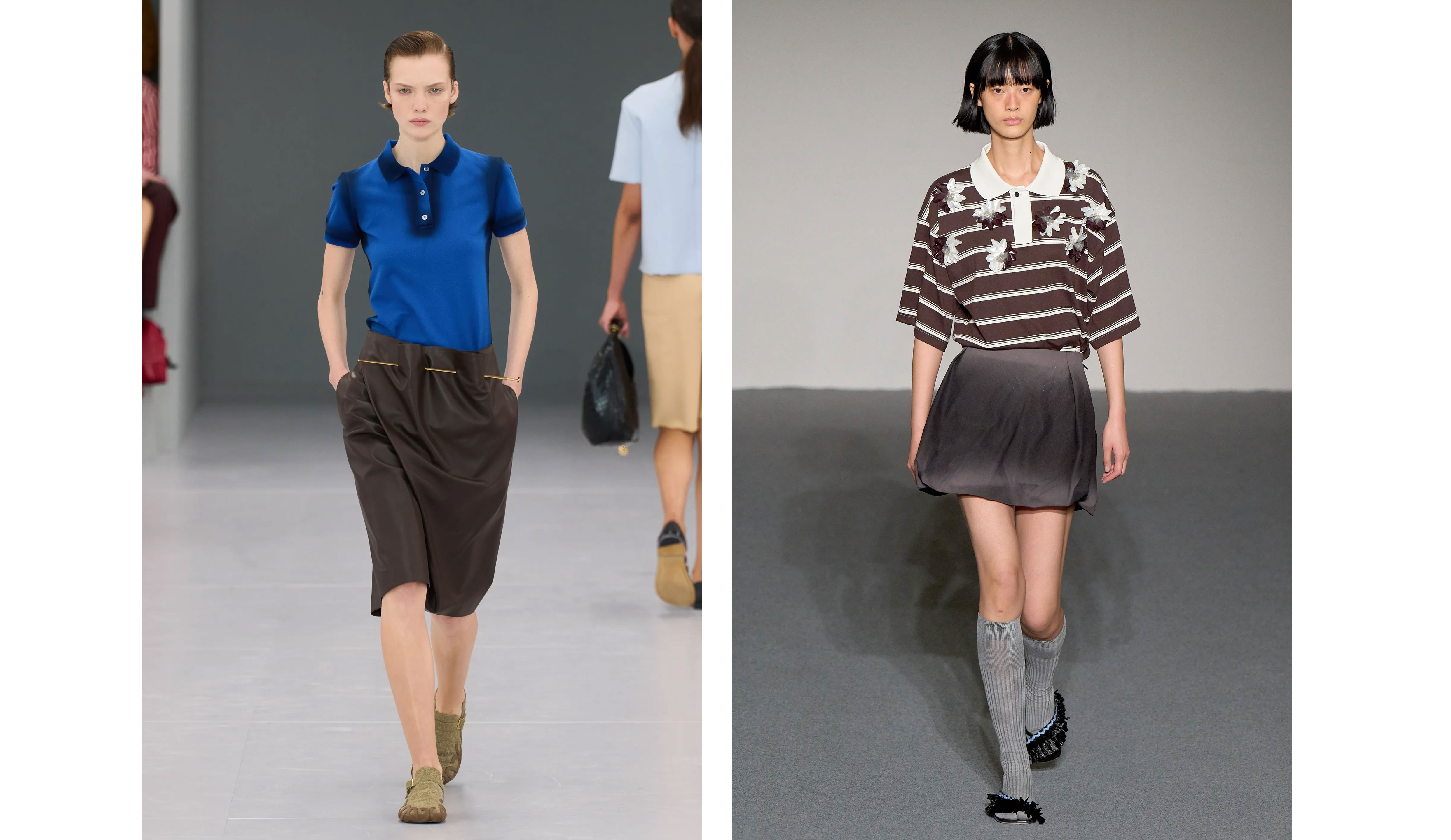 У 2023 році tenniscore («естетика тенісу») став великим трендом, що домінував як на корті, так і в наших телефонах, ставши прикладом нової одержимості спортивним дозвіллям. Після того, як мікроспідниця повернулася після 2000-х, її аналог — тенісна сукня — теж почала знову з’являтися на горизонті. Не кажучи вже про те, що жіноча футболка-поло органічно підпадає під концепцію «тихої розкоші», що останнім часом домінує у модному просторі. Футболка-поло — це проста річ, яку легко носити, і, можливо, саме тому ми бачимо, як вона переосмислюється за межами моди 2000-х, та стає чимось унікальним, «гострим», особливо якщо її вкоротити або носити в нестандартний спосіб.