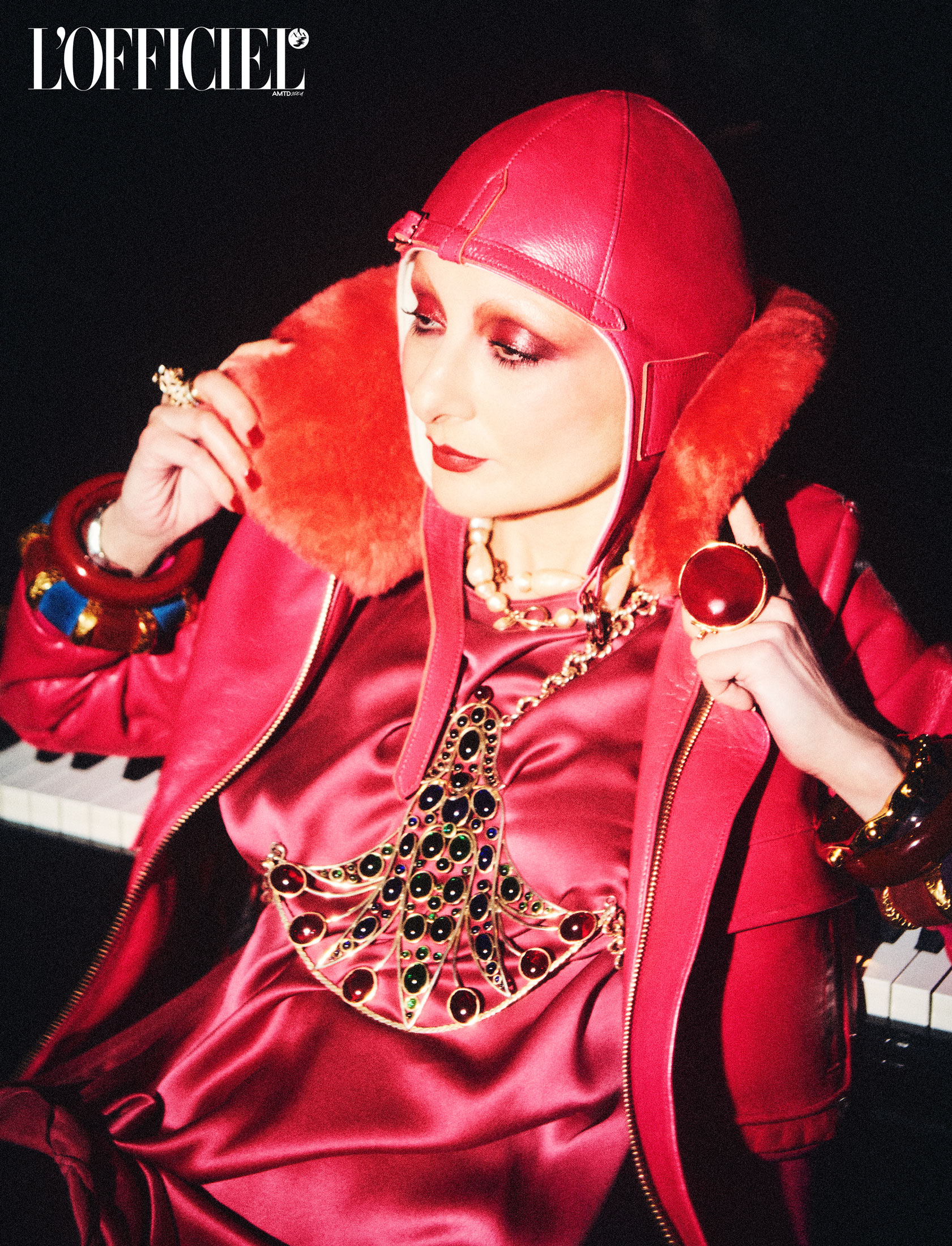 Жакет та головний убір, LEATHERETTES для DEVOTION X CHAPAL, cукня, RICK OWENS, каблучка CAT RING, BOUCHERON, намисто PHOENIX HARNESS, власність CATHERINE BABA, намисто з перлин, LOULOU DE LA FALAISE, каблучка RED VENUS MIRROR RING, CATHERINE BABA для GRIPOIX, манжети та браслети RED DONUT, ELSA PERETTI для TIFFANY & CO., вінтажні браслети, YSL