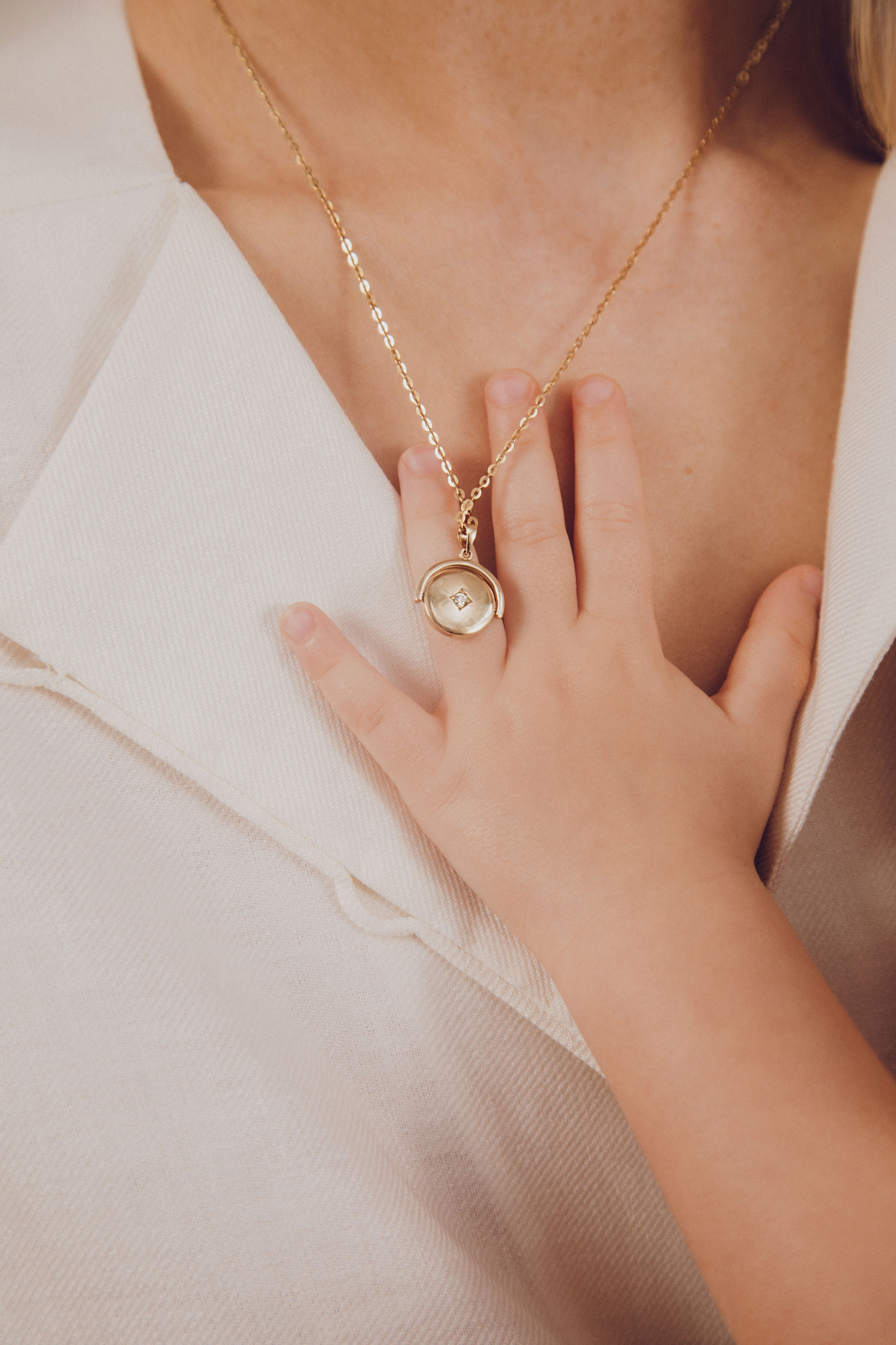 Два кулони представлені у різних розмірах та нагадують круглий маятник, який обертається. З кожним обертом маятника ви ніби переглядаєте архів найцінніших спогадів на двох з мамою. Третій підвіс у капсулі — особливий — це медальйон, який відкривається та зберігає всередині ваше послання до мами у вигляді гравіювання.