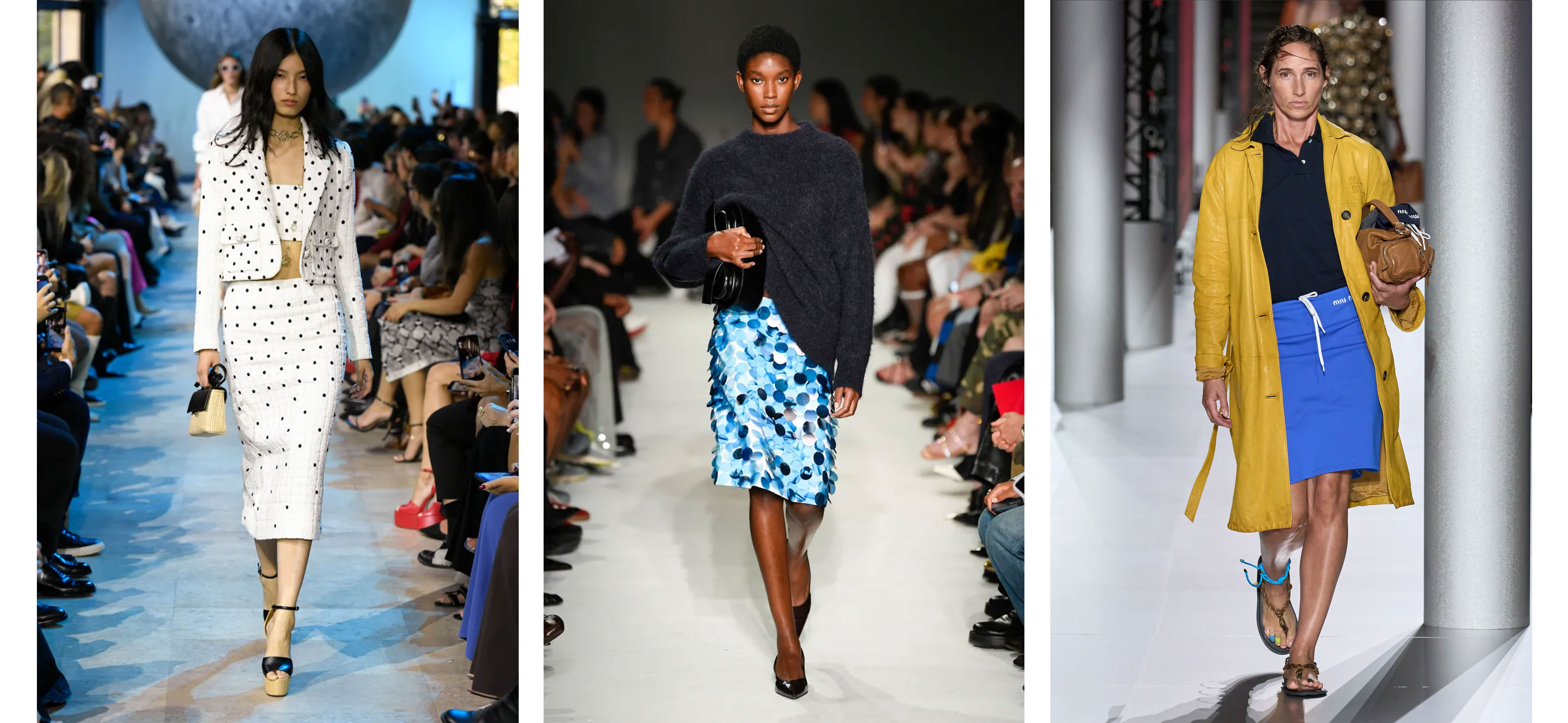 Класичні спідниці-олівці, які стають ідеальним доповненням класичного образу, не втрачають актуальності. А втім, у сезоні весна-літо 2024 дизайнери пропонують додати яскравості в образи з цим елементом гардероба. 16Arlington — із яскравими масивними синіми лелітками, які гармонійно поєднується з сірим светром з ангори. Elie Saab — із трендовим гороховим принтом, скомбінованим із кроп-топом і жакетом, а Miu Miu, — представивши спідницю-олівець у стилі спорт-шик.
