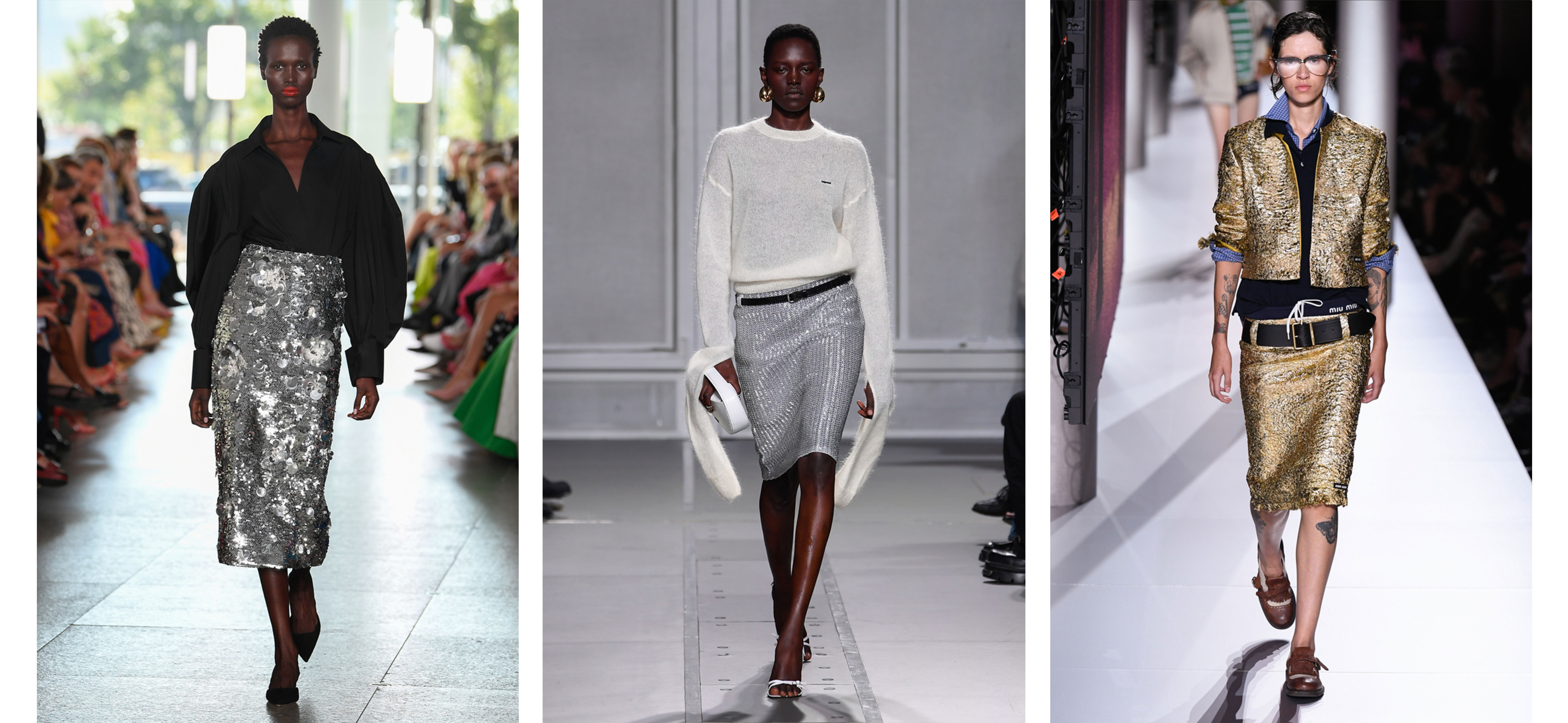 Цього сезону металічні відтінки очолюють тренди кольорів, тож органічно спідниці в такому забарвленні є не менш актуальними. Такі моделі мають потенціал стати ефектним доповненням вечірнього образу, що підтверджують ансамблі з колекцій Coperni, Miu Miu й Carolina Herrera.