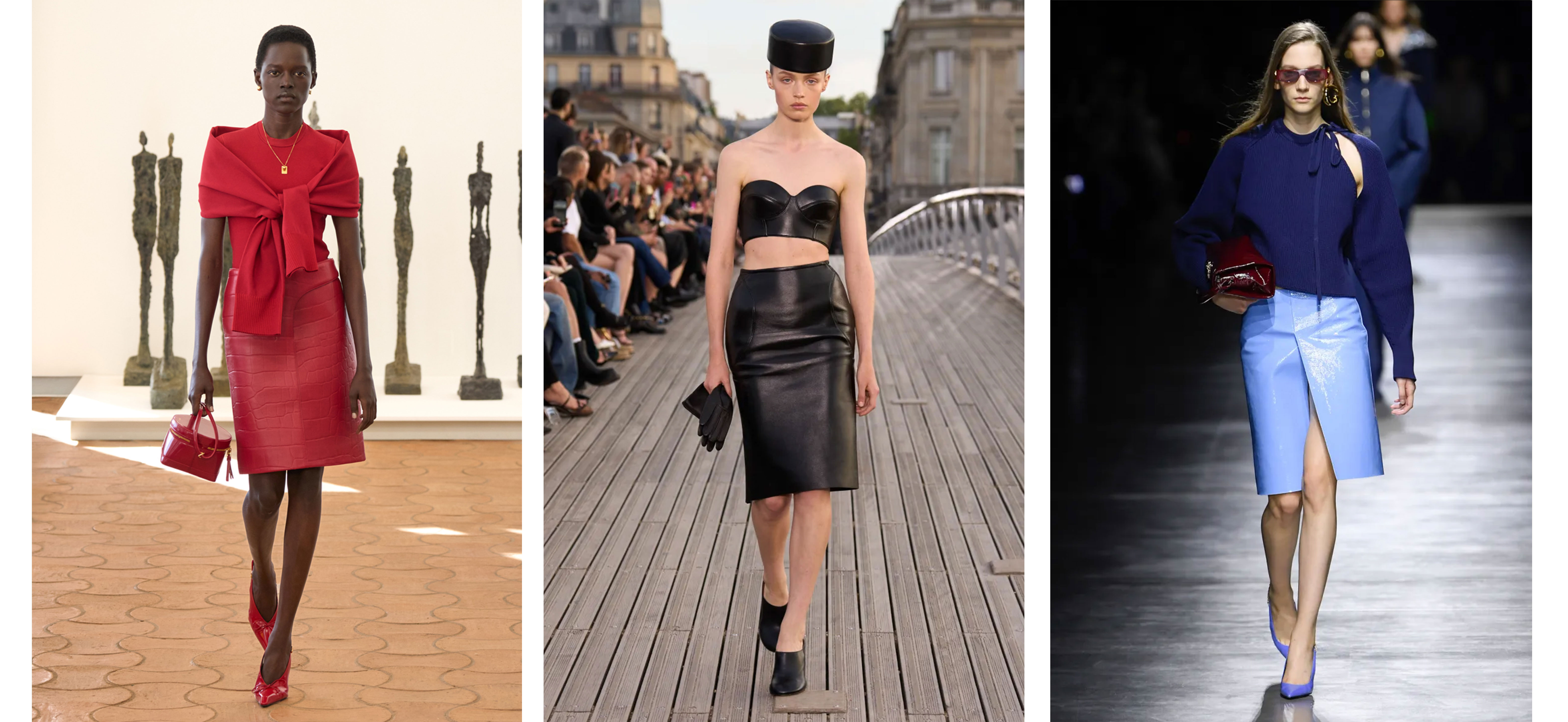 Шкіряні спідниці залишаються на піку своєї слави вже кілька сезонів, як серед стрітстайл зірок, так і на подіумах. Унікальність їхньої інтерпретації цього весняно-літнього періоду — сміливе використання кольору. Це чудово ілюструє монохромний червоний образ від Jacquemus, а також синьо-бордове поєднання в ансамблі Gucci. Якщо ж ви прихильники класичних опцій, чорна шкіряна модель, як в Alaïa, стане позачасовою інвестицією.