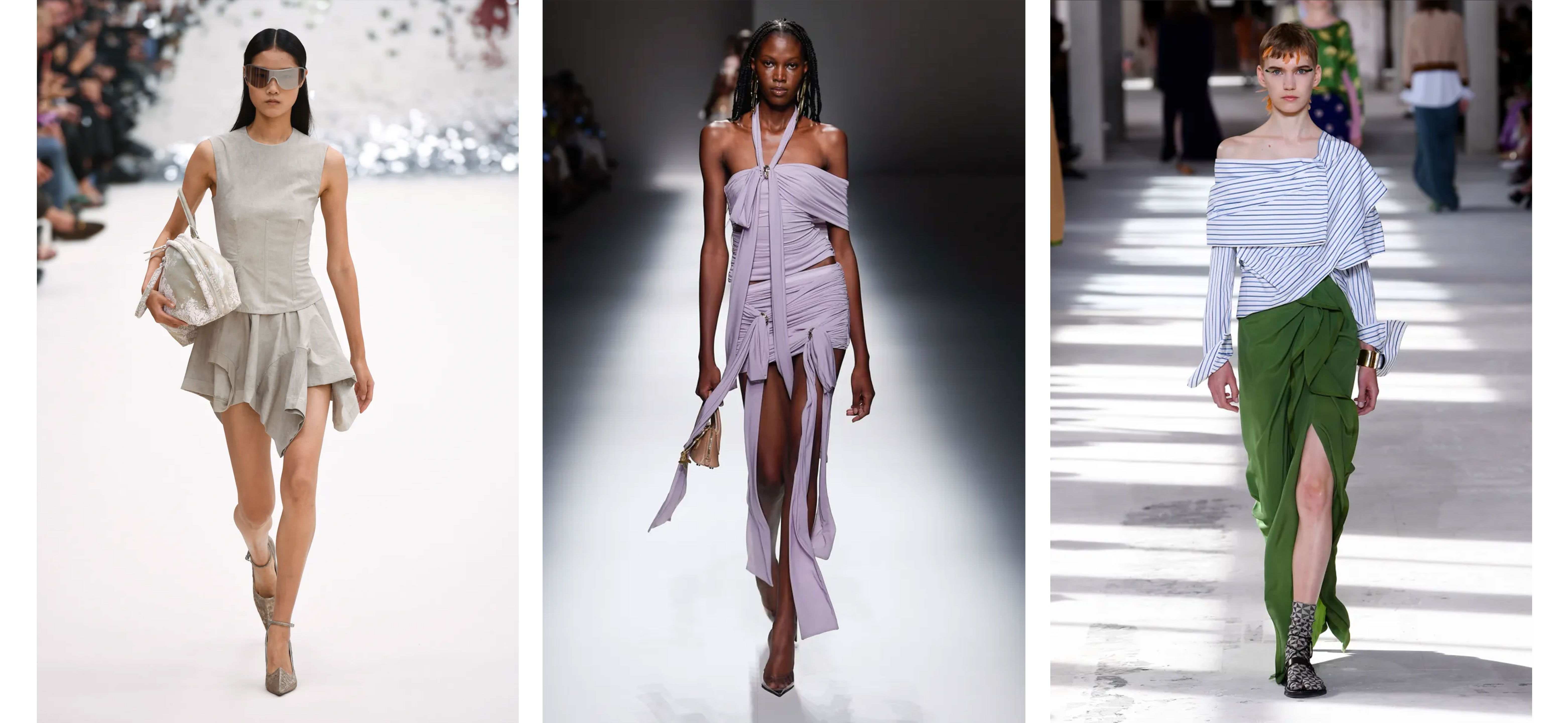 Цієї весни та літа модні будинки й бренди широко інтегрують у свої образи струмливі та об’ємні силуети. До такого грайливого вибору вдалися, зокрема, Acne Studios з асиметричною міні, а також Dries Van Noten і Blumarine, що представили драпіровані спідниці.