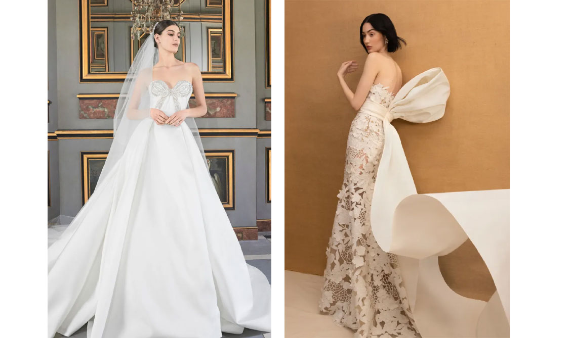 Вже кілька сезонів поспіль мода захоплена бантами, і ми розуміємо чому: цей акцент із легкістю додає в образ грайливість та романтичність. У 2024 році тенденція на цю деталь впевнена прокладає шлях у весільні колекції. Вона набуває, як більш драматичного вигляду з величезними бантами, що прикрашають талію або спину, так і ніжного з невеликими, але акцентними, які мають форму декору. Незалежно від того, чи ви шукаєте вишукану мінісукню, довгу зі шлейфом чи образ на вечірку опісля — цей тренд варто тримати на радарі.