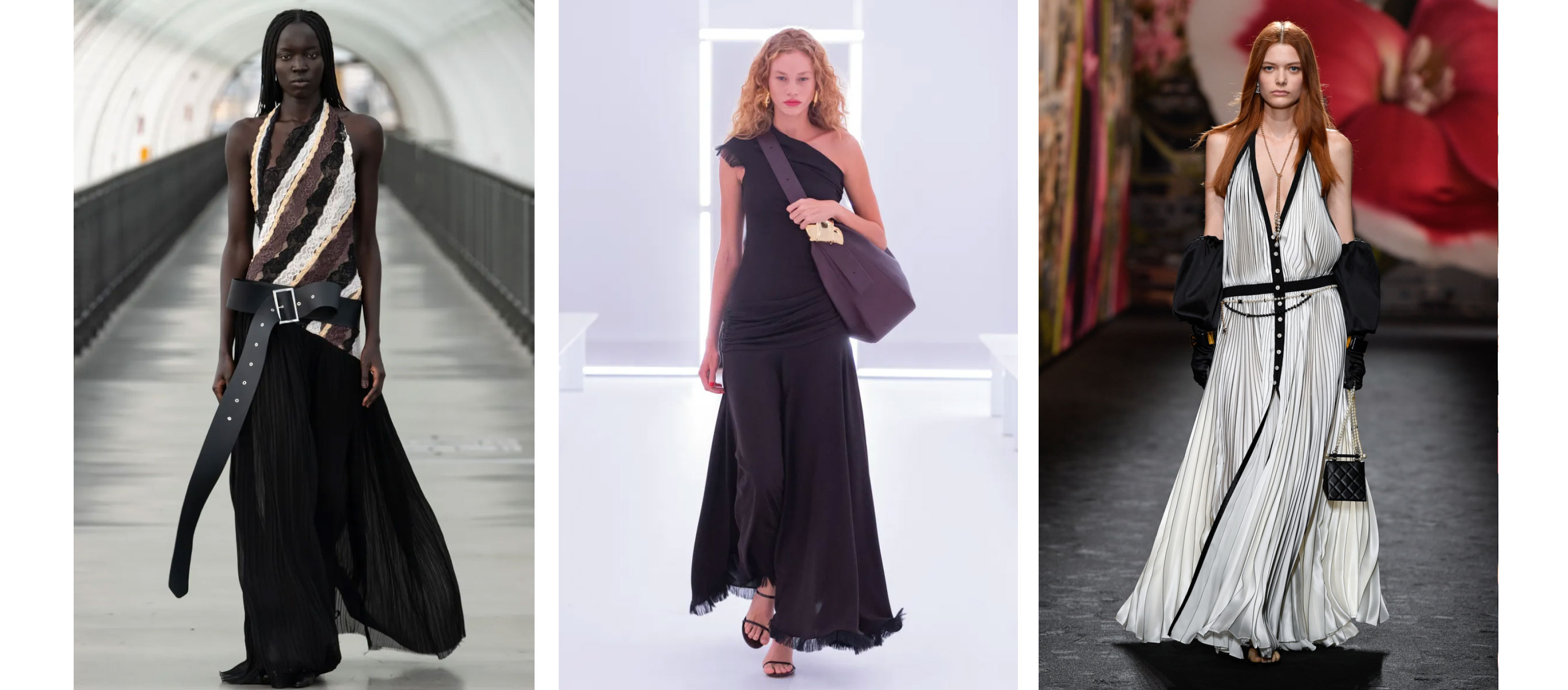 Для любителів відтінків гранжу актуальним стане ансамбль від Vaillant. Його інгредієнти — масивний стейтмент-ремінь, що знову прокладає шлях з 00-х у моду, асиметрична занижена талія й мереживний печворк. І, навпаки, дорогу до серцець прихильників більш класичного тренд також знаходить — зі спокусливою смугастою максісукнею Chanel та драпірованою на талії від Brandon Maxwell.
