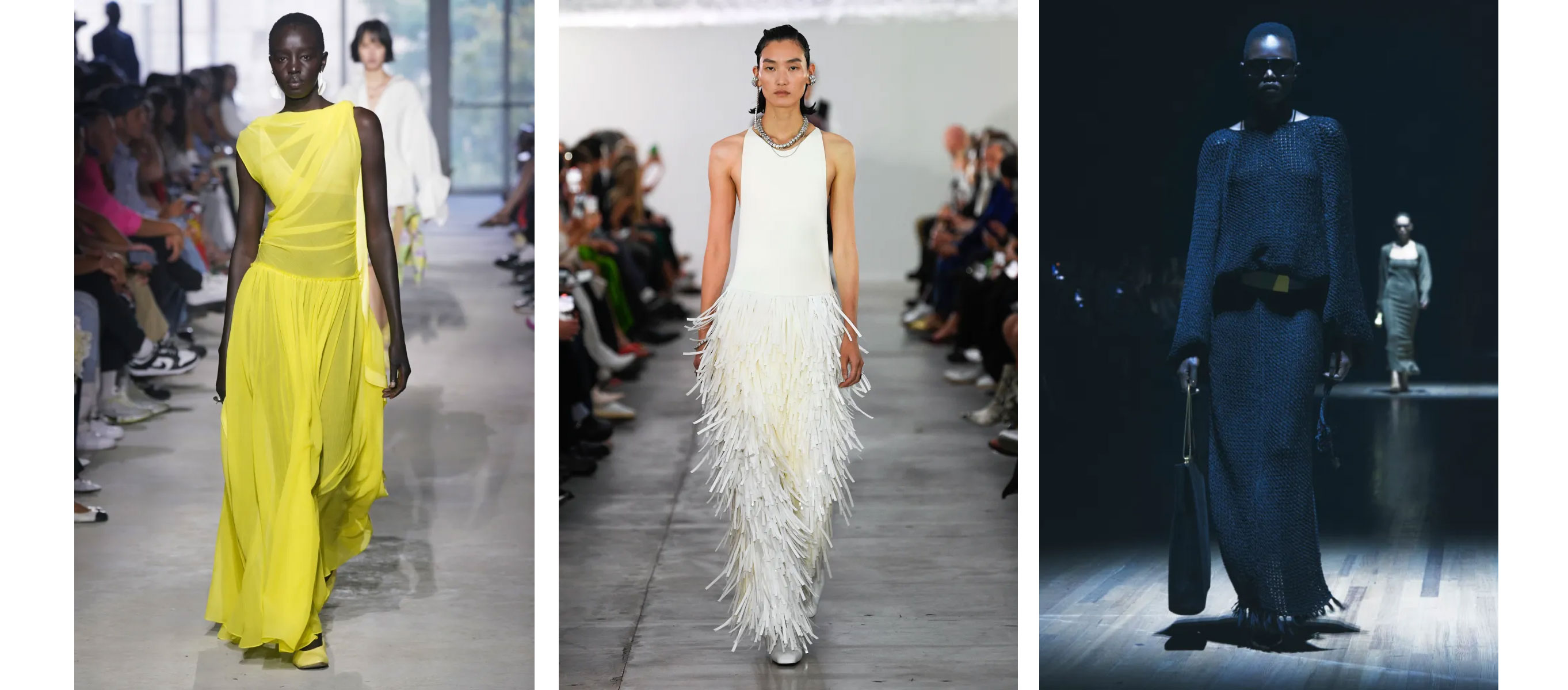 Власну інтерпретацію цієї тенденції представили у 3.1 Phillip Lim — із яскравою й сексуальною жовтою сукнею, що додасть барвистості в літні дні. Заразом для тих, хто шукає якомога ефектніший варіант для вечірніх виходів, натхненням стане вбрання від Jil Sander. Їхня сукня зі струмливою трендовою бахромою — витончена інвестиція, не позбавлена грайливості. Якщо ж ви бажаєте додати у свій гардероб невимушену позицію, актуальною стане модель від Khaite: її просторість і легкість ідеальні для літа.